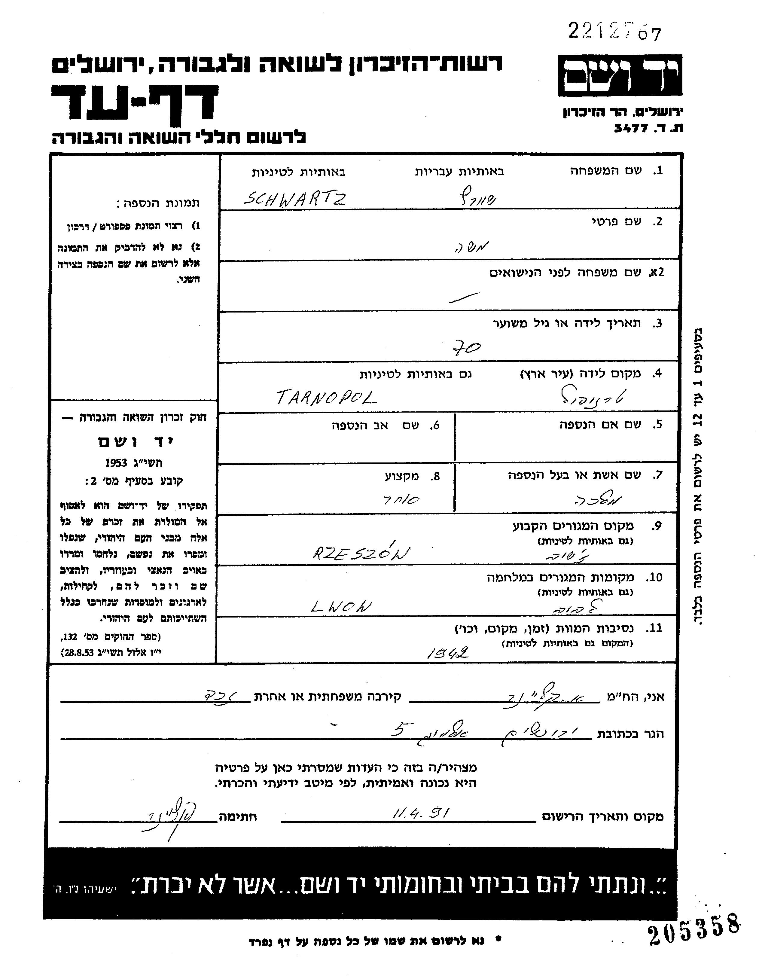 Moshe Schwartz wurde im Jahr 1872 in Tarnopol, Polen geboren. Er war Kaufmann/-frau und mit Malka Verheiratet. Vor dem Zweiten Weltkrieg lebte er in Rzeszow, Polen. Während des Krieges war er in Lwow, Polen.