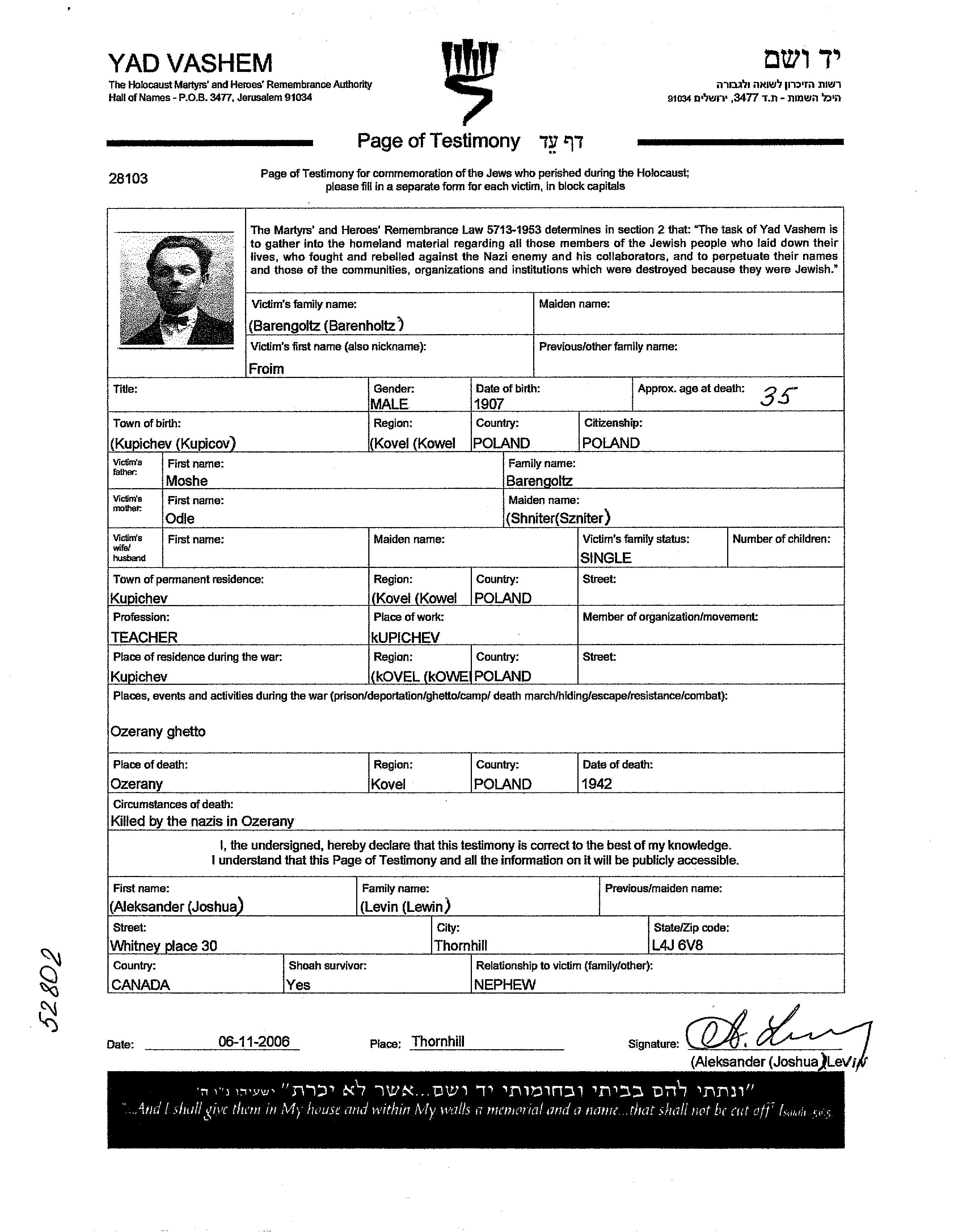 Froim Barengoltz wurde im Jahr 1907 in Kupiczow, Polen geboren. Er war Lehrer/in. Vor dem Zweiten Weltkrieg lebte er in Kupiczow, Polen.