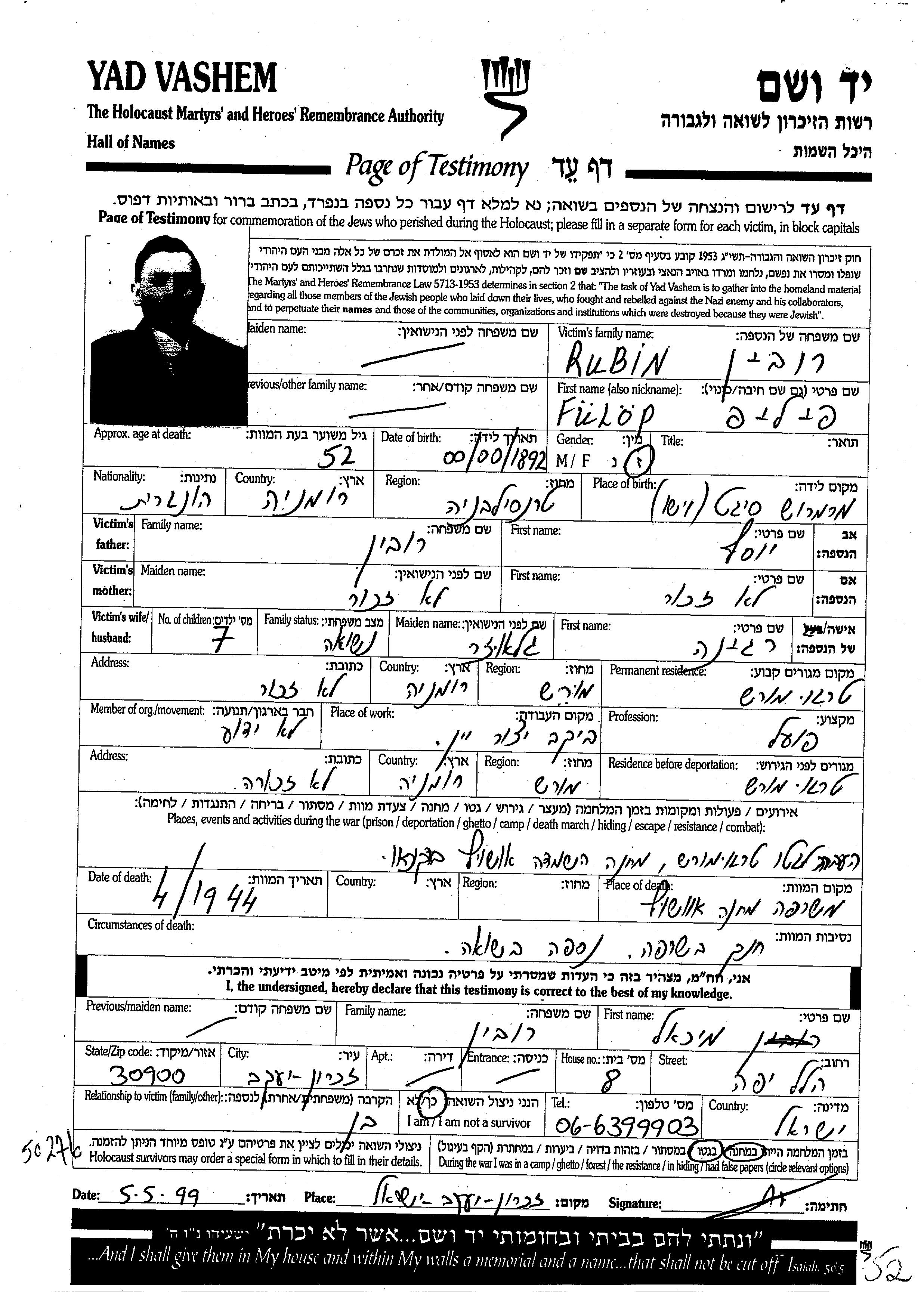 Fulop Rubin wurde im Jahr 1892 in Sighet, Rumänien geboren. Er war Arbeiter/-in. Vor dem Zweiten Weltkrieg lebte er in Targu Mures, Rumänien.