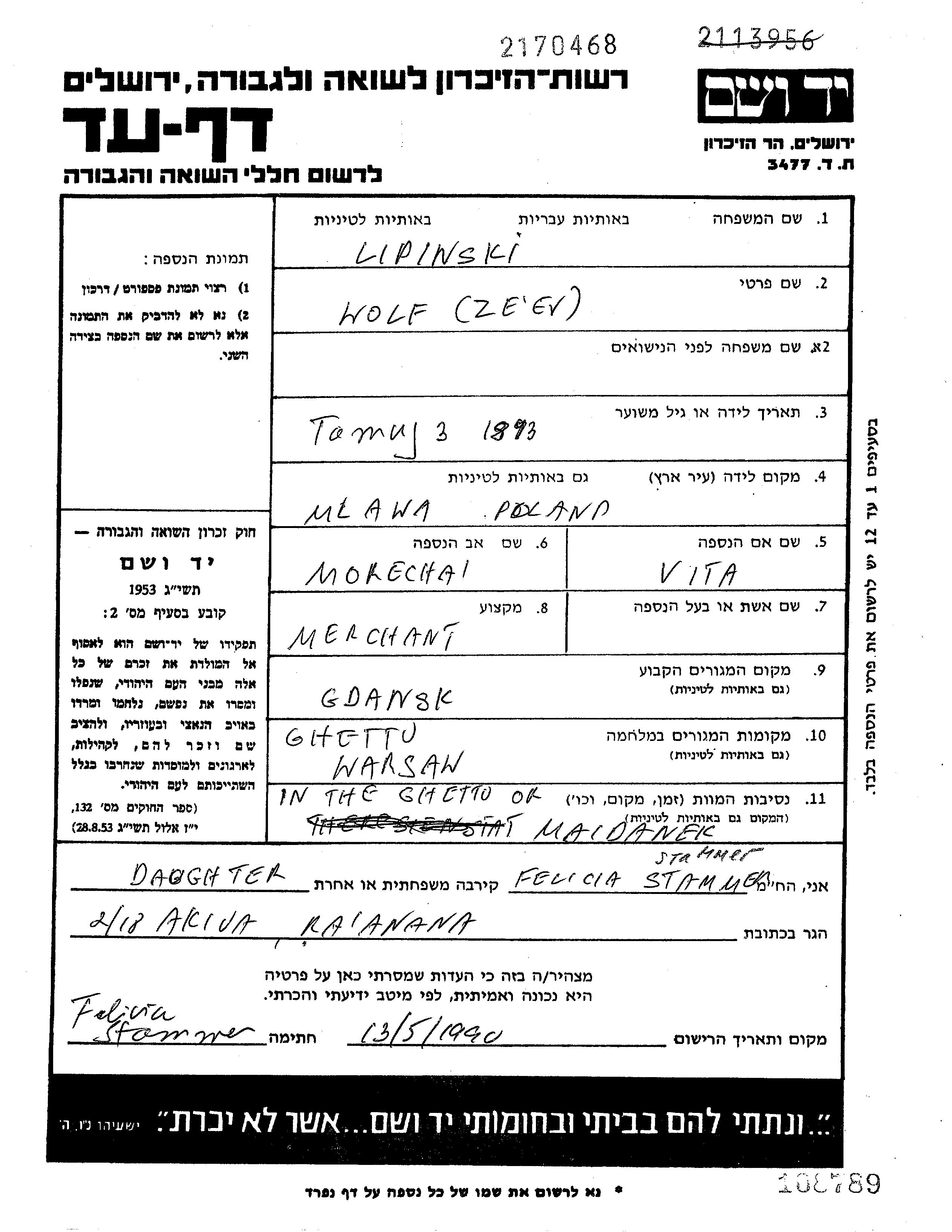 Wolf Zeev Lipinski wurde im Jahr 1893 in Mlawa, Polen geboren. Er war der Sohn von Mordechai und Vita. Er war Kaufmann/-frau. Vor dem Zweiten Weltkrieg lebte er in Gdansk, Freie Stadt Danzig. Während des Krieges war er in Warszawa, Polen.