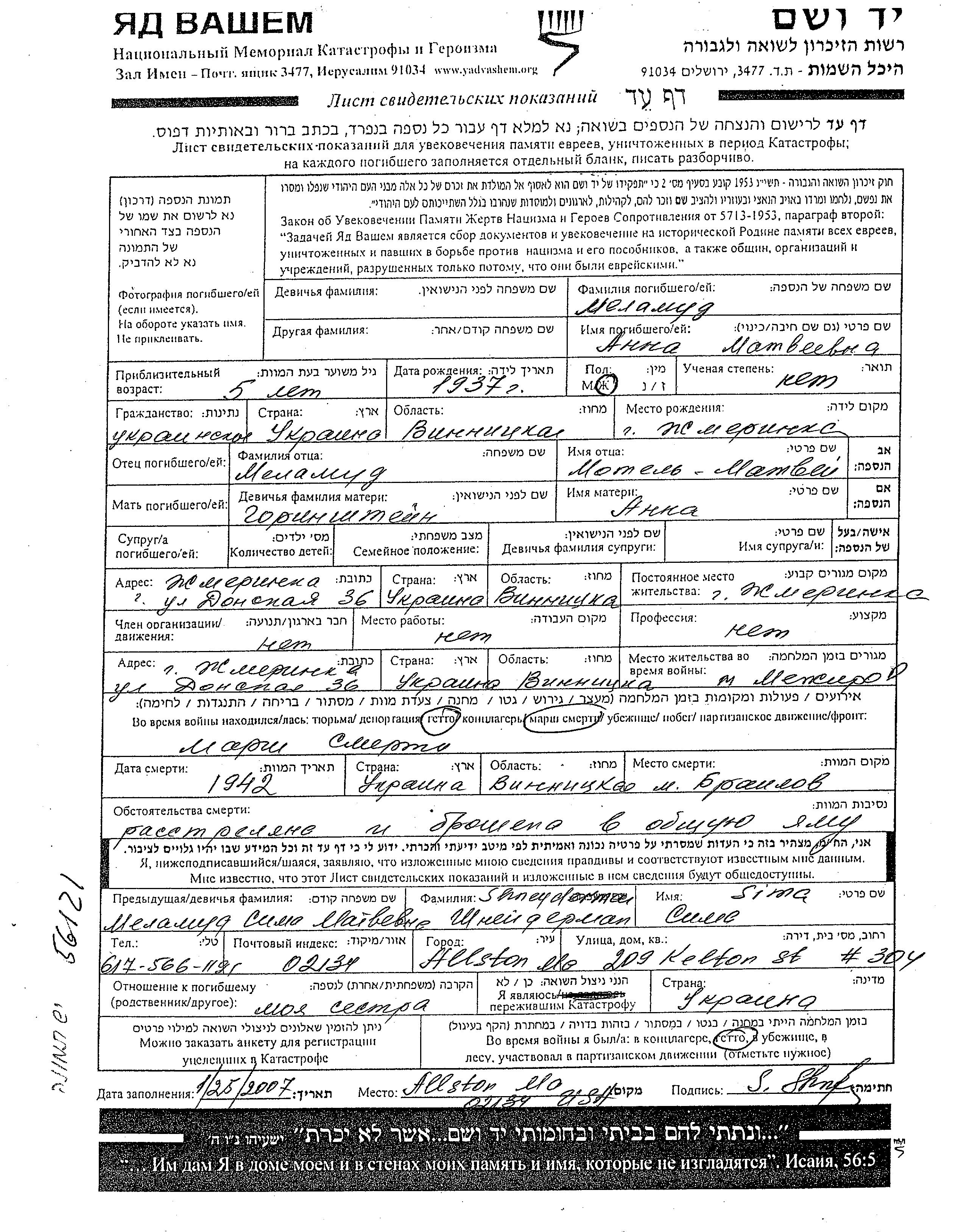 Melamud Anna 1937 Zhmerinka, Ukraine (UdSSR) Gedenkblatt