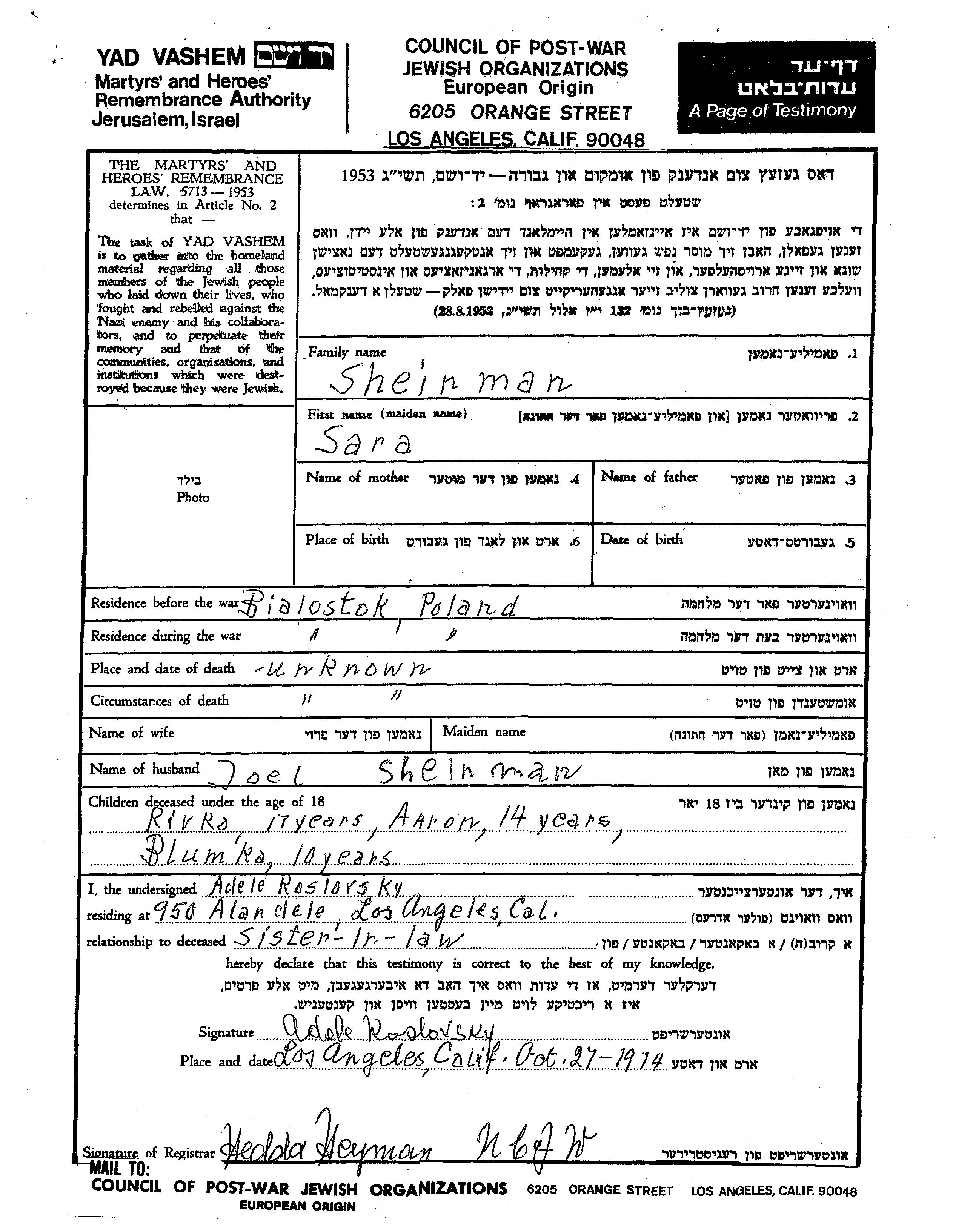 Sara Sheinman wurde in Bialystok, Polen geboren. Vor dem Zweiten Weltkrieg lebte sie in Bialystok, Polen.