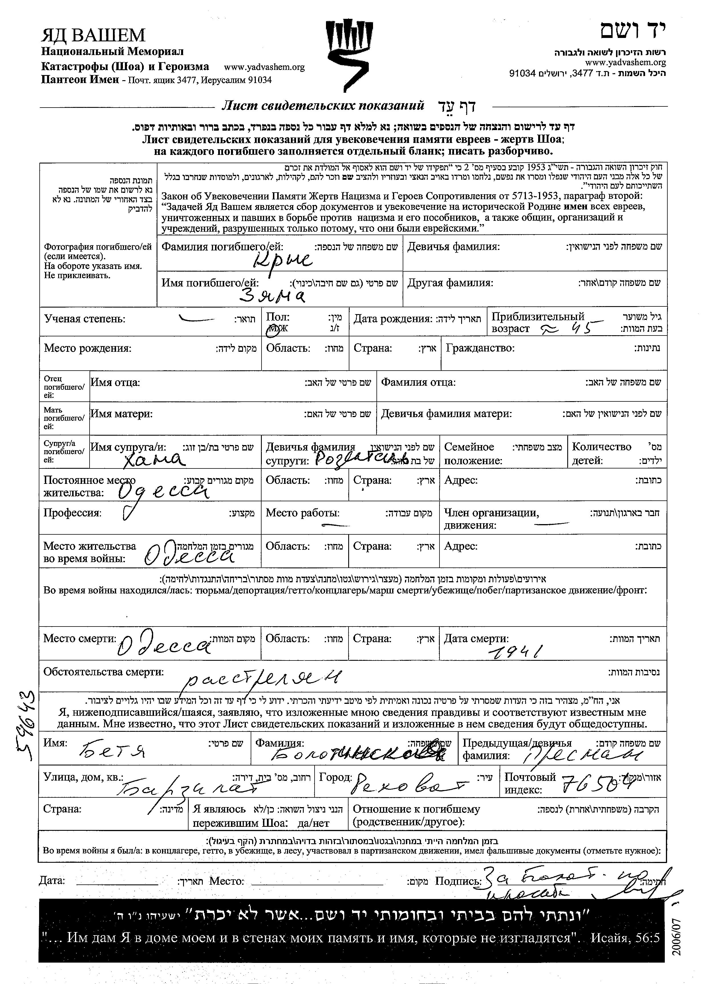 Zyama wurde in der Schoah ermordet. Todesort: Odessa, Ukraine (UdSSR) im Jahr 1941.