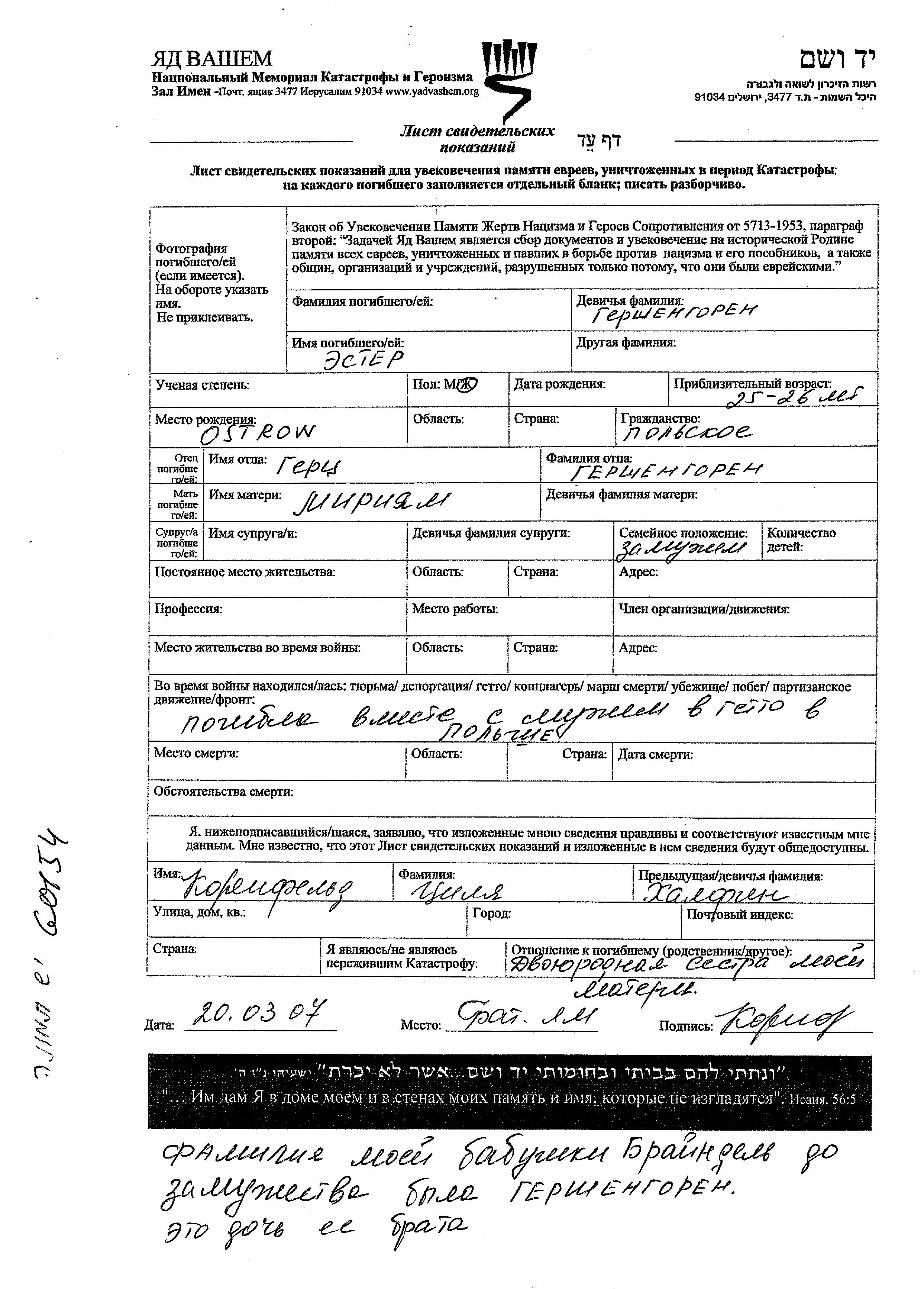 Ester Name unbekannt, geb. Gershengoren wurde in Ostrów Mazowiecka, Polen geboren. Vor dem Zweiten Weltkrieg lebte sie in Ostrów Mazowiecka, Polen.