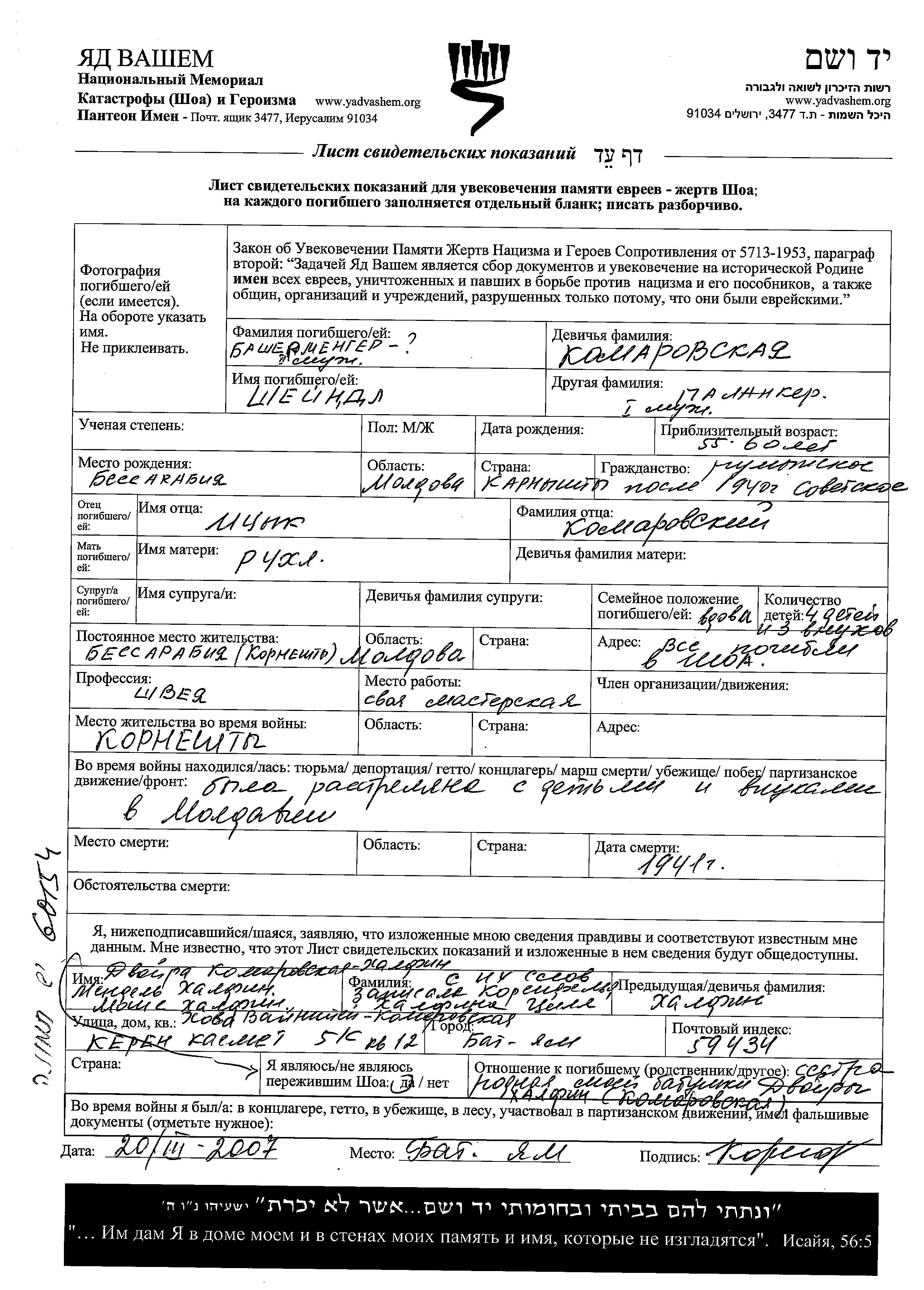 Sheindl Bashermenger, geb. Komarovskaya wurde im Jahr 1884 in Cornesti, Rumänien geboren. Sie war Shveya russian. Vor dem Zweiten Weltkrieg lebte sie in Cornesti, Rumänien.