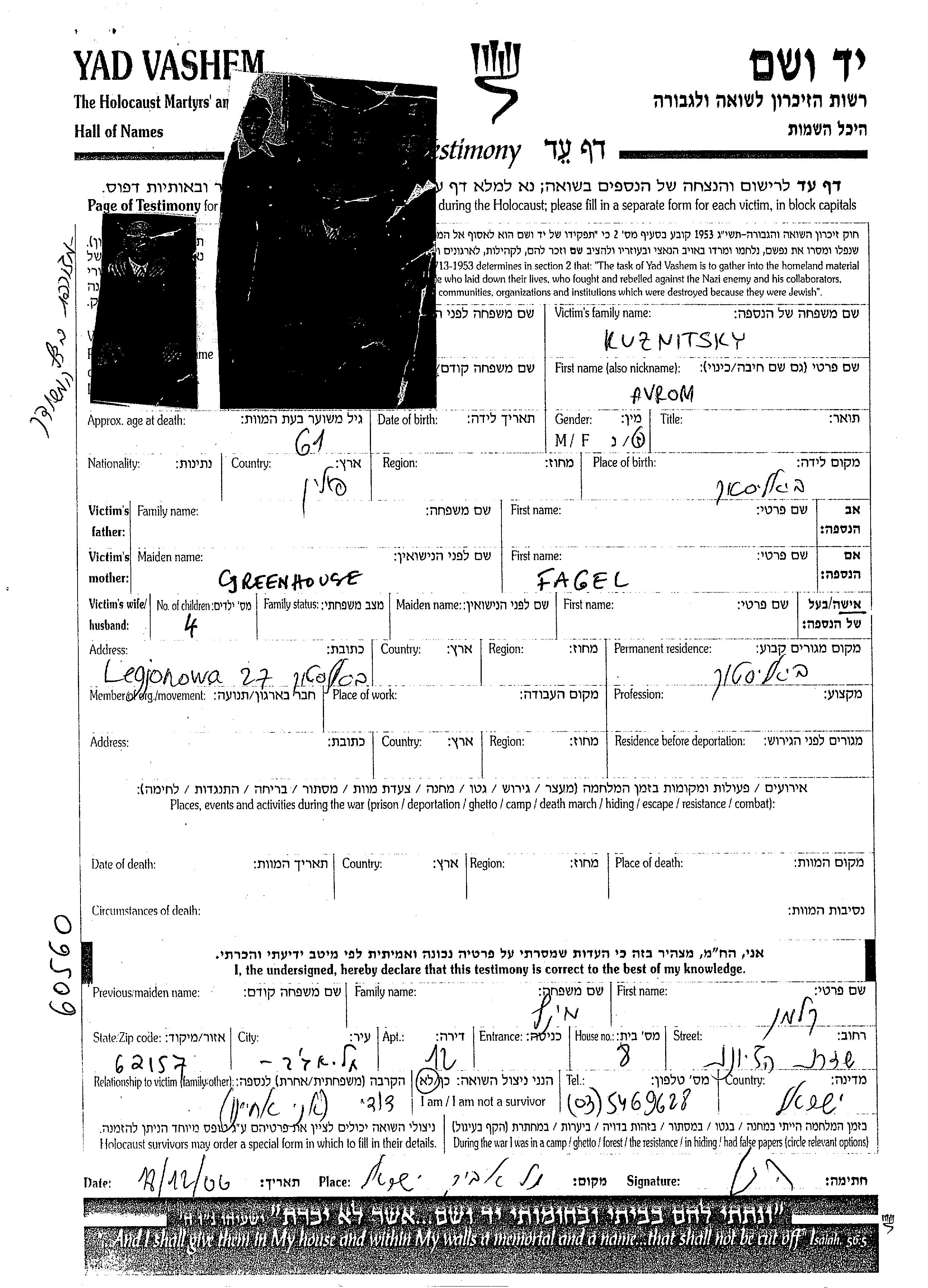 Avrom Kuznitsky wurde in Bialystok, Polen geboren. Vor dem Zweiten Weltkrieg lebte er in Bialystok, Polen.