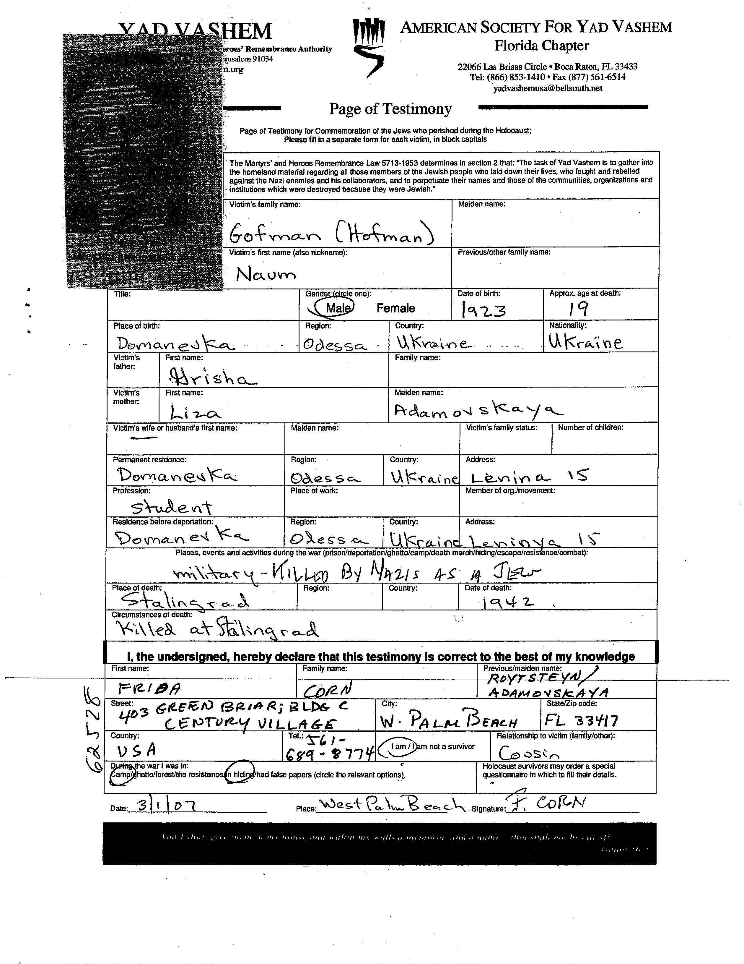 Naum Gofman Hofman wurde im Jahr 1923 in Domanevka, Ukraine (UdSSR) geboren. Er war Student. Vor dem Zweiten Weltkrieg lebte er in Domanevka, Ukraine (UdSSR).