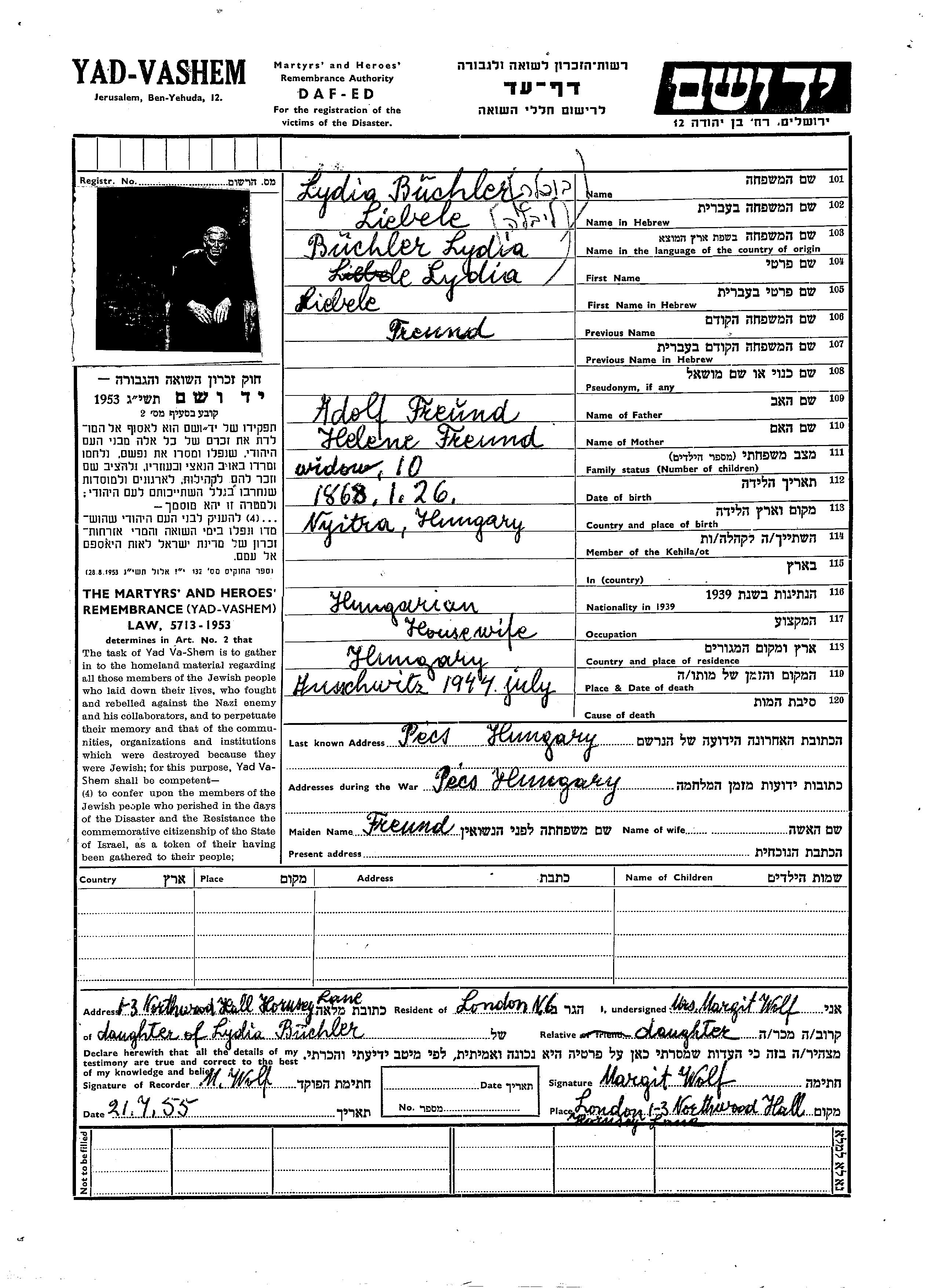 Lydia Liebele Buchler, geb. Freund wurde im Jahr 1868 in Nyitra, Tschechoslowakei geboren. Sie war Hausfrau. Vor dem Zweiten Weltkrieg lebte sie in Pecs, Ungarn.