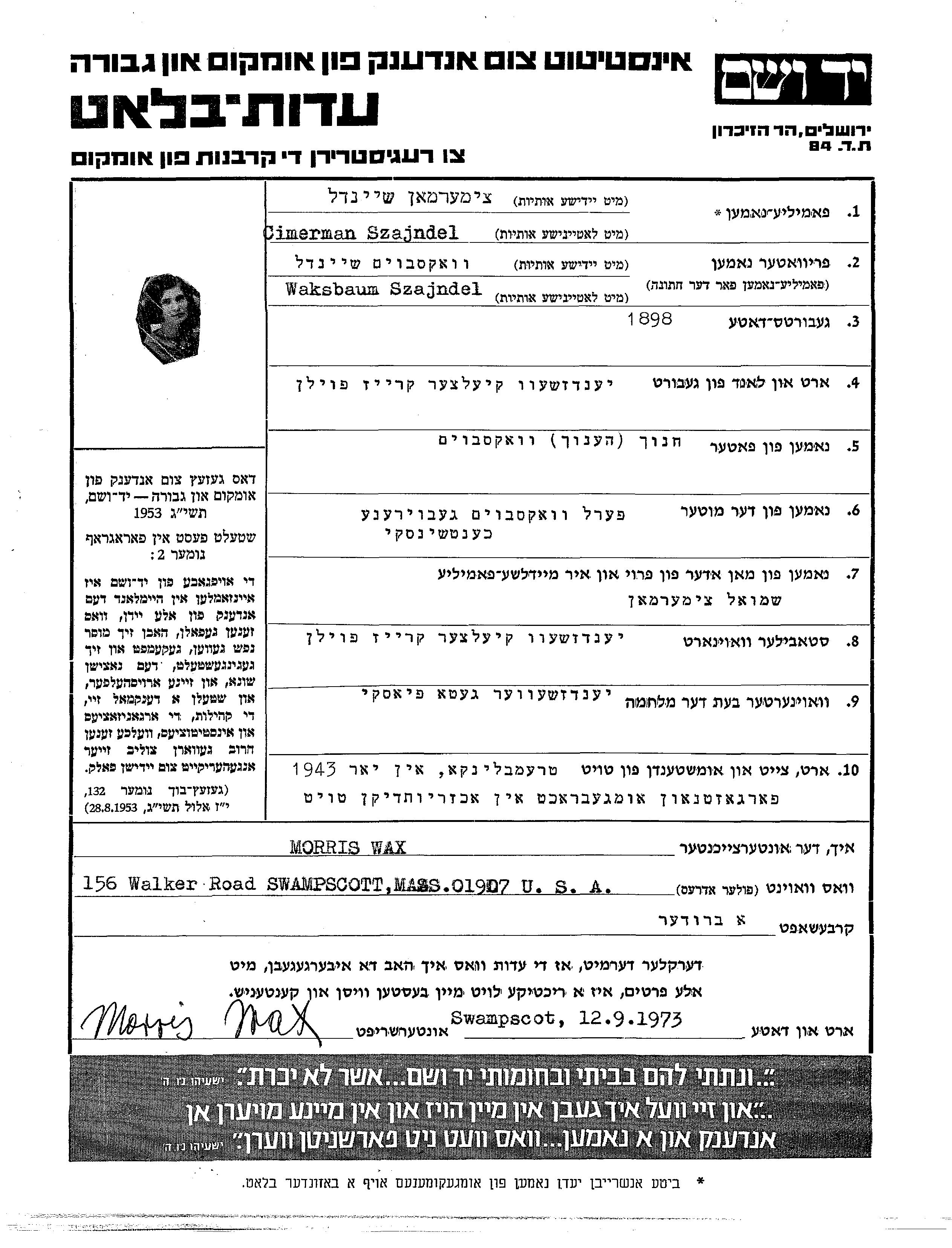 Szajndel Cimerman, geb. Waksbaum wurde im Jahr 1898 in Jedrzejow, Polen geboren. Vor dem Zweiten Weltkrieg lebte sie in Jedrzejow, Polen.