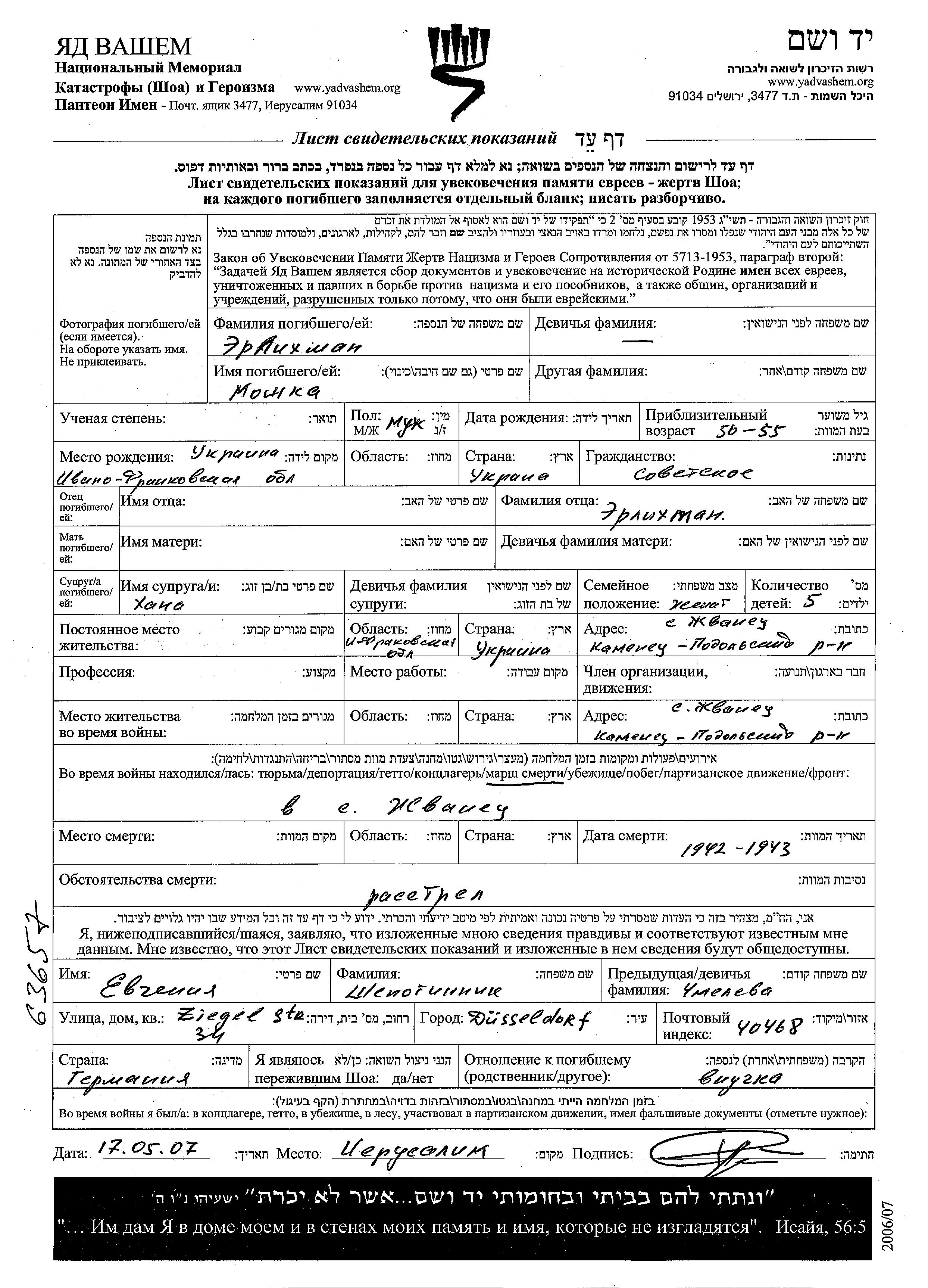 Moshka wurde in der Schoah ermordet. Todesort: Zhvanets, Ukraine (UdSSR) im Jahr 1942.
