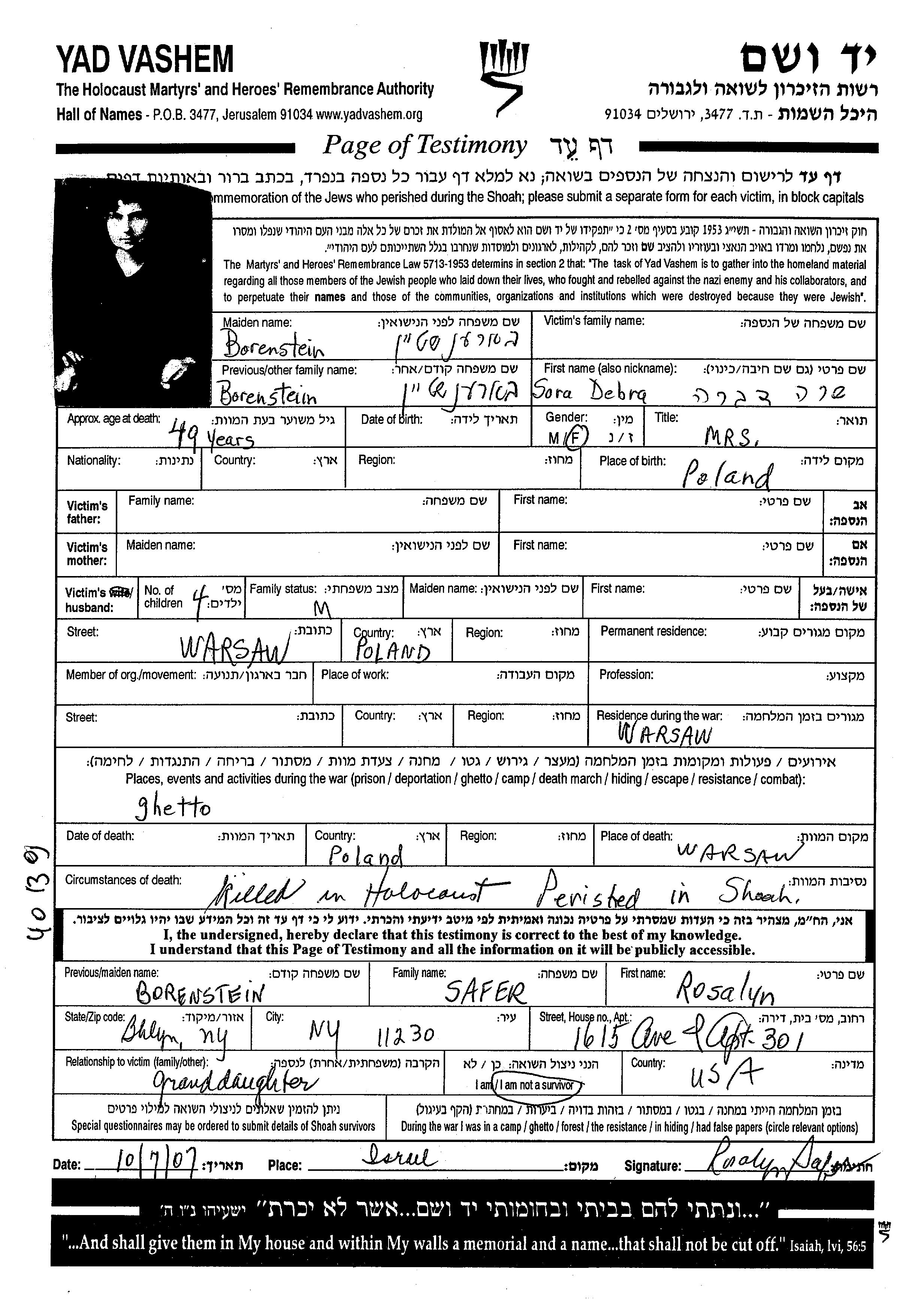 Borenstein Sara Debra Varsha, Polen Gedenkblatt