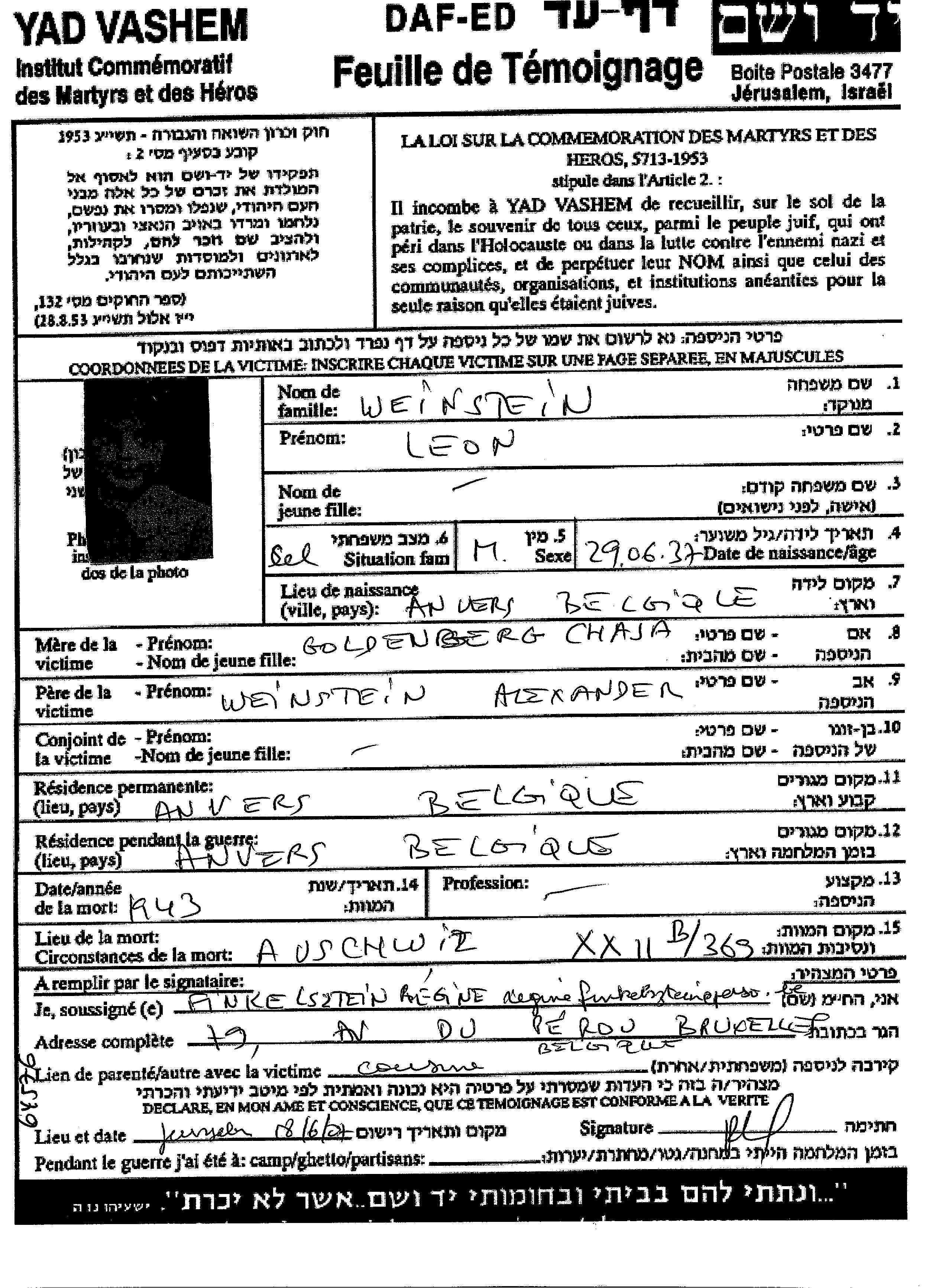 Weinstein Leon 1937 Anvers, Belgien Gedenkblatt