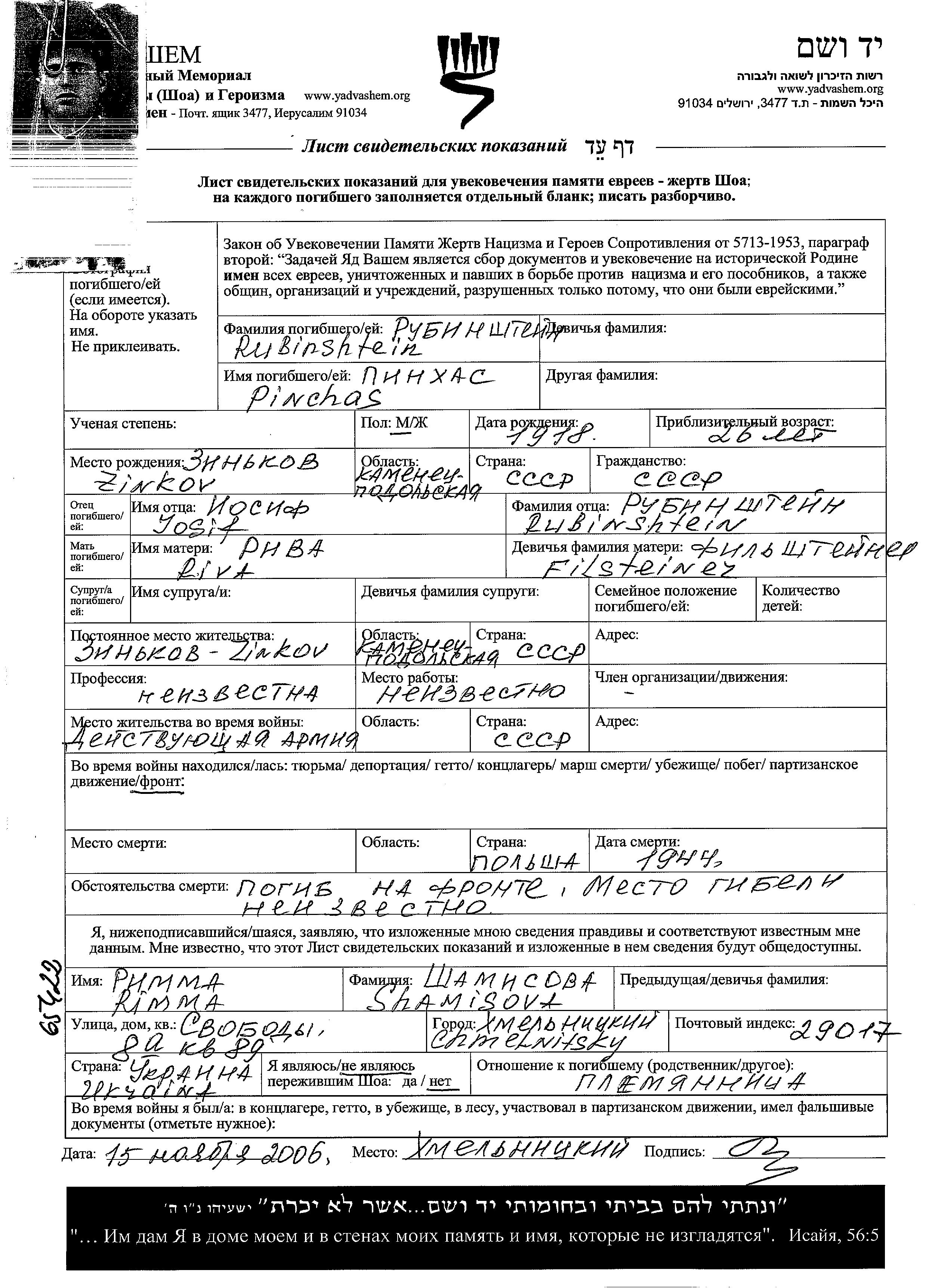 Rubinshtein | Pinkhas | 1918 | Zinkov, Ukraine (UdSSR) | Gedenkblatt |