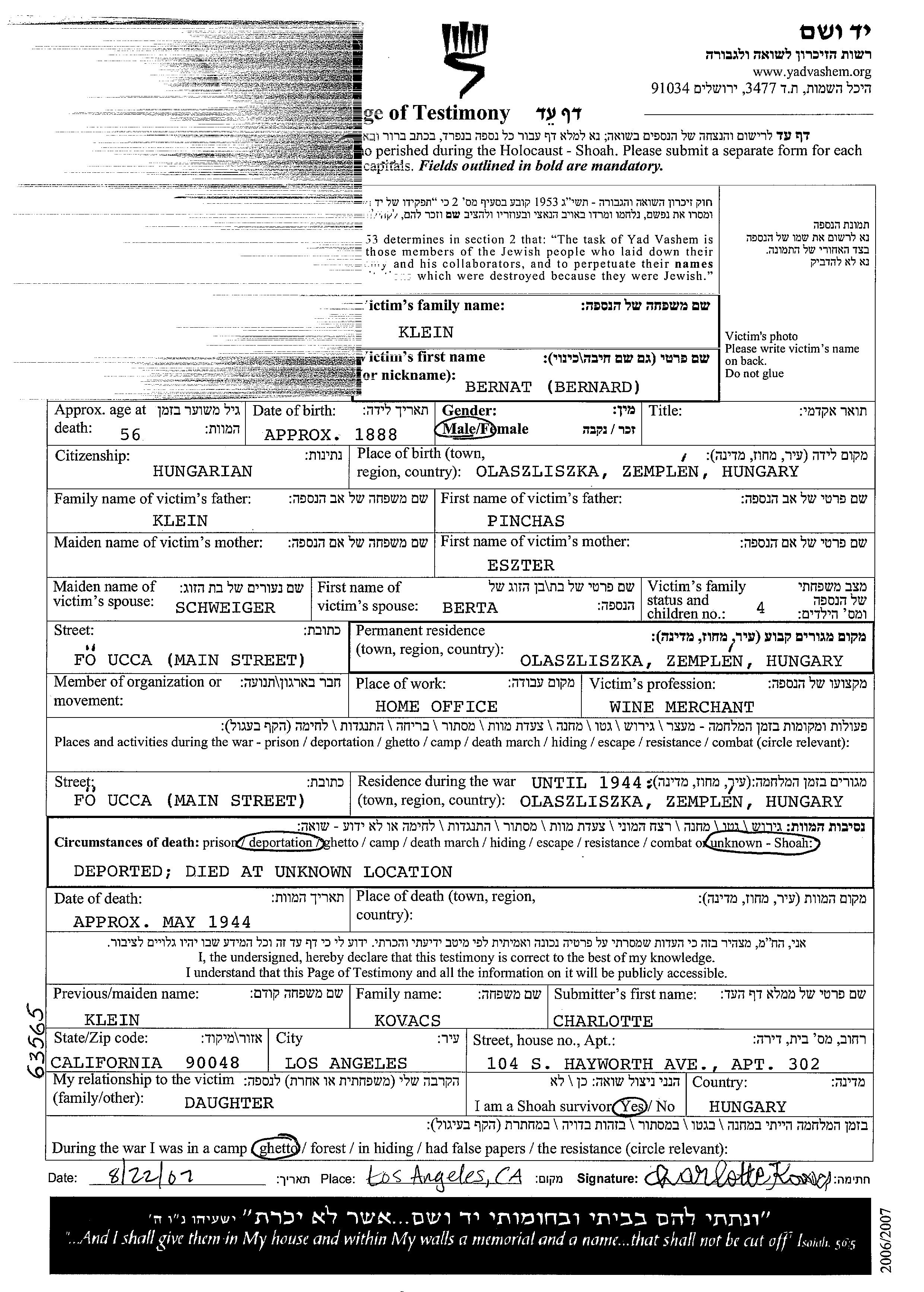 Bernat Klein wurde im Jahr 1888 in Olaszliszka, Ungarn geboren. Er war Weinhändler. Vor dem Zweiten Weltkrieg lebte er in Olaszliszka, Ungarn.