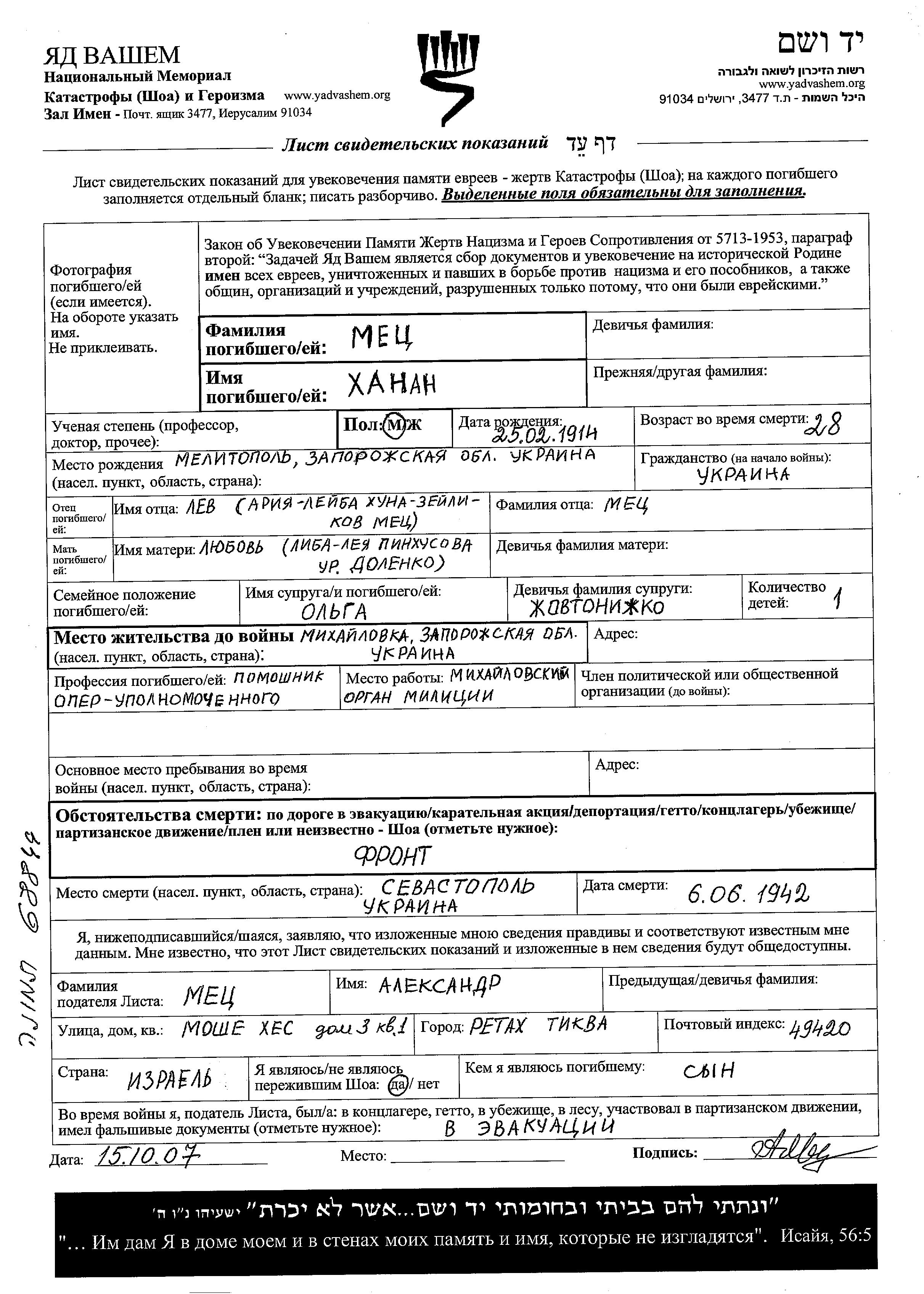 Khanan Metz wurde im Jahr 1914 in Melitopol, Ukraine (UdSSR) geboren. Er war Polizist. Vor dem Zweiten Weltkrieg lebte er in Mikhailovka, Ukraine (UdSSR).