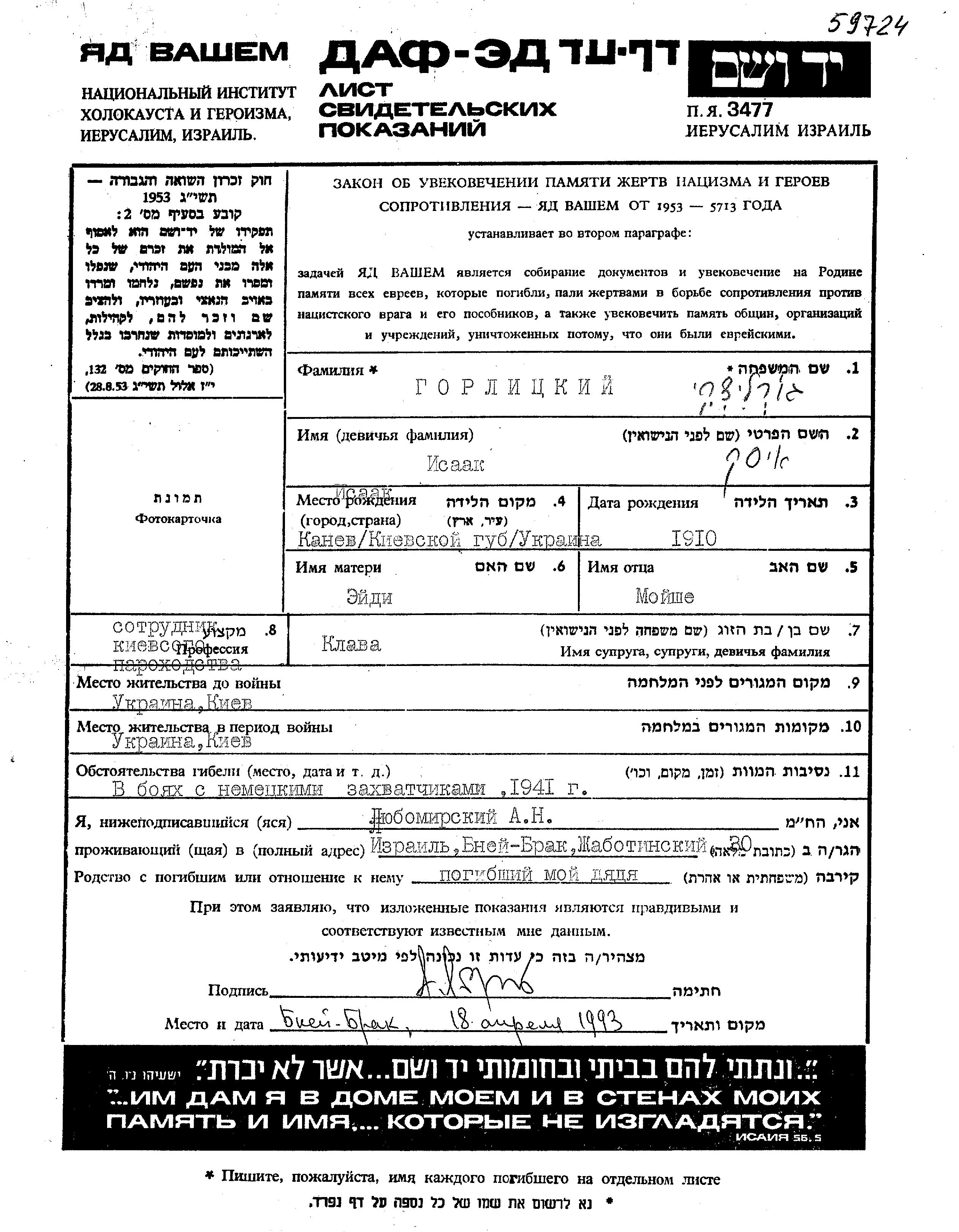 Isaak Gorlitzki wurde im Jahr 1910 in Kanev, Ukraine (UdSSR) geboren. Er war der Sohn von Moishe und Eidi, geb. Sokolov. Er war Angestellte/-r und mit Klaudia Verheiratet. Vor dem Zweiten Weltkrieg lebte er in Kiyev, Ukraine (UdSSR). Während des Krieges war er in die Sowjetischen Streitkräfte. Isaak im Militärdienst umgekommen. Todesort: unbekannt im Jahr 1941.