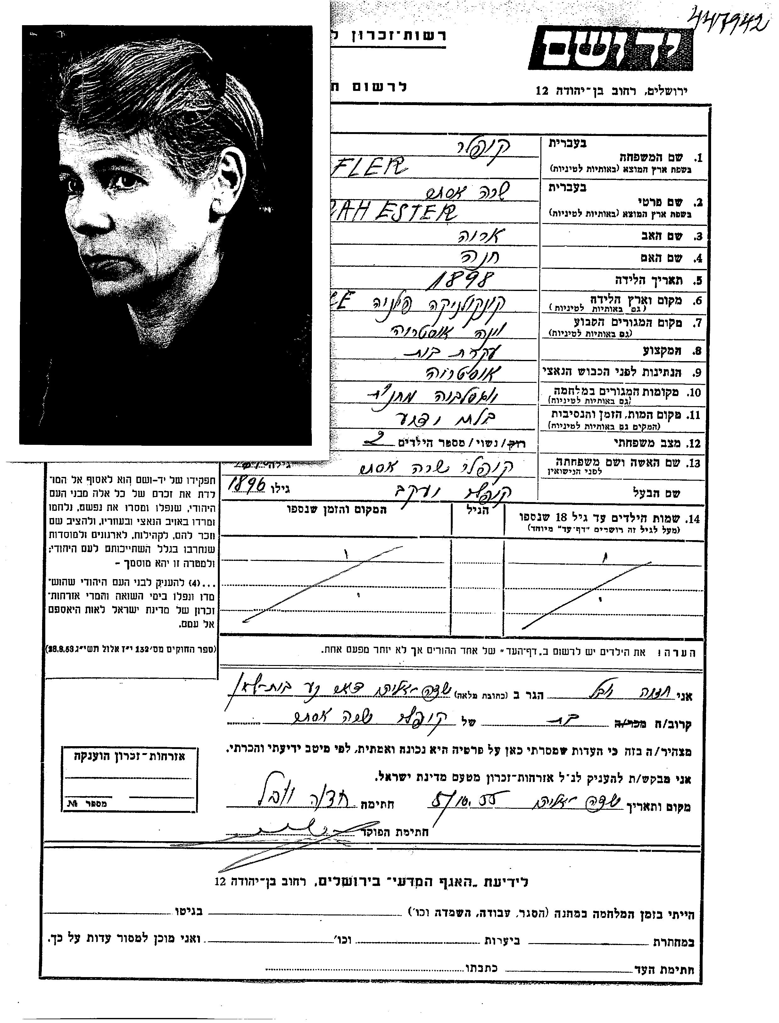 Sarah Ester Kofler wurde im Jahr 1898 in Konkolniki, Polen geboren. Sie war Hausfrau. Vor dem Zweiten Weltkrieg lebte sie in Wien, Österreich.
