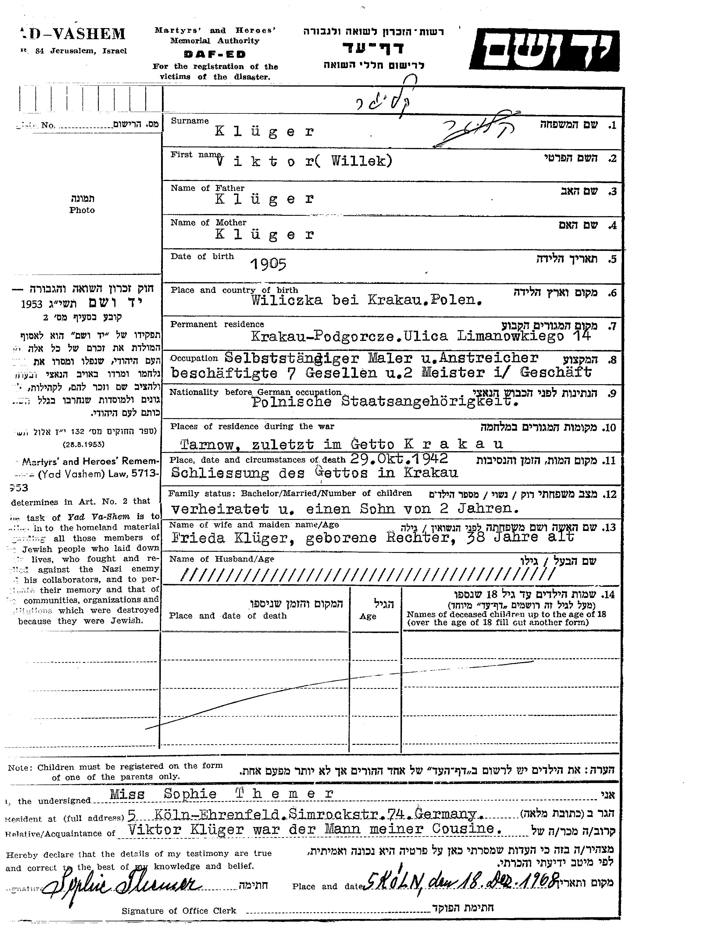 Fruma Klieger Klüger, geb. Teichman wurde im Jahr 1902 in Oświęcim, Polen geboren. Vor dem Zweiten Weltkrieg lebte sie in Oświęcim, Polen.