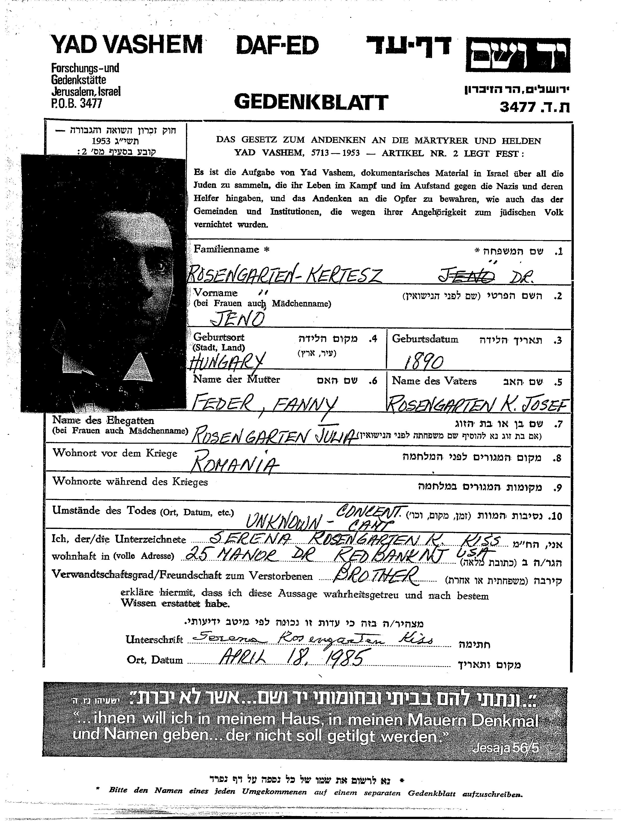 Jeno Rosengarten Kertesz wurde im Jahr 1890 in Ungarn geboren. Vor dem Zweiten Weltkrieg lebte er in Rumänien.