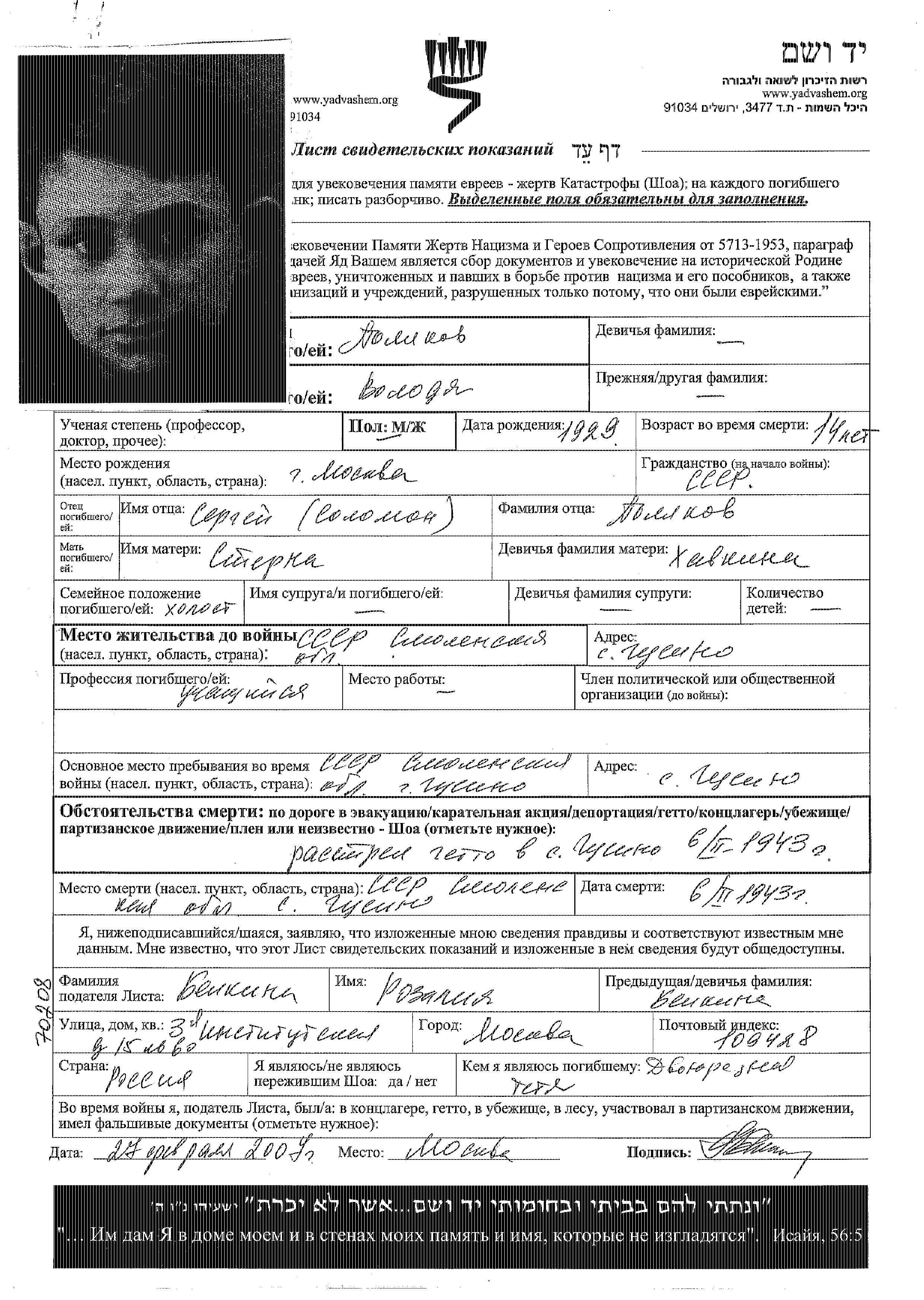 Volodya wurde in der Schoah ermordet. Todesort: Gusino, Russland (UdSSR) im Jahr 06/02/1943.