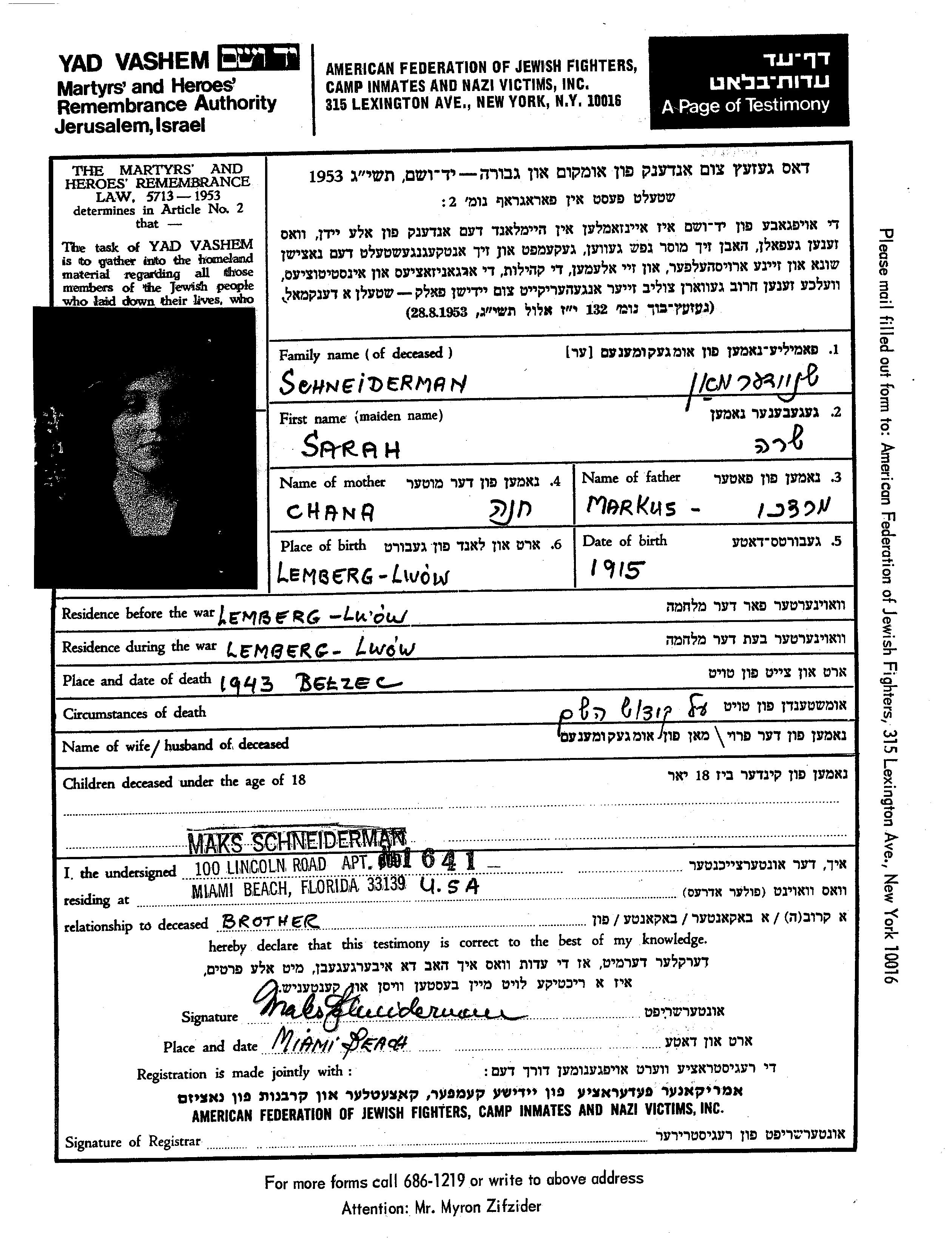 Sarah Schneiderman wurde im Jahr 1915 in Lwow, Polen geboren. Vor dem Zweiten Weltkrieg lebte sie in Lwow, Polen.