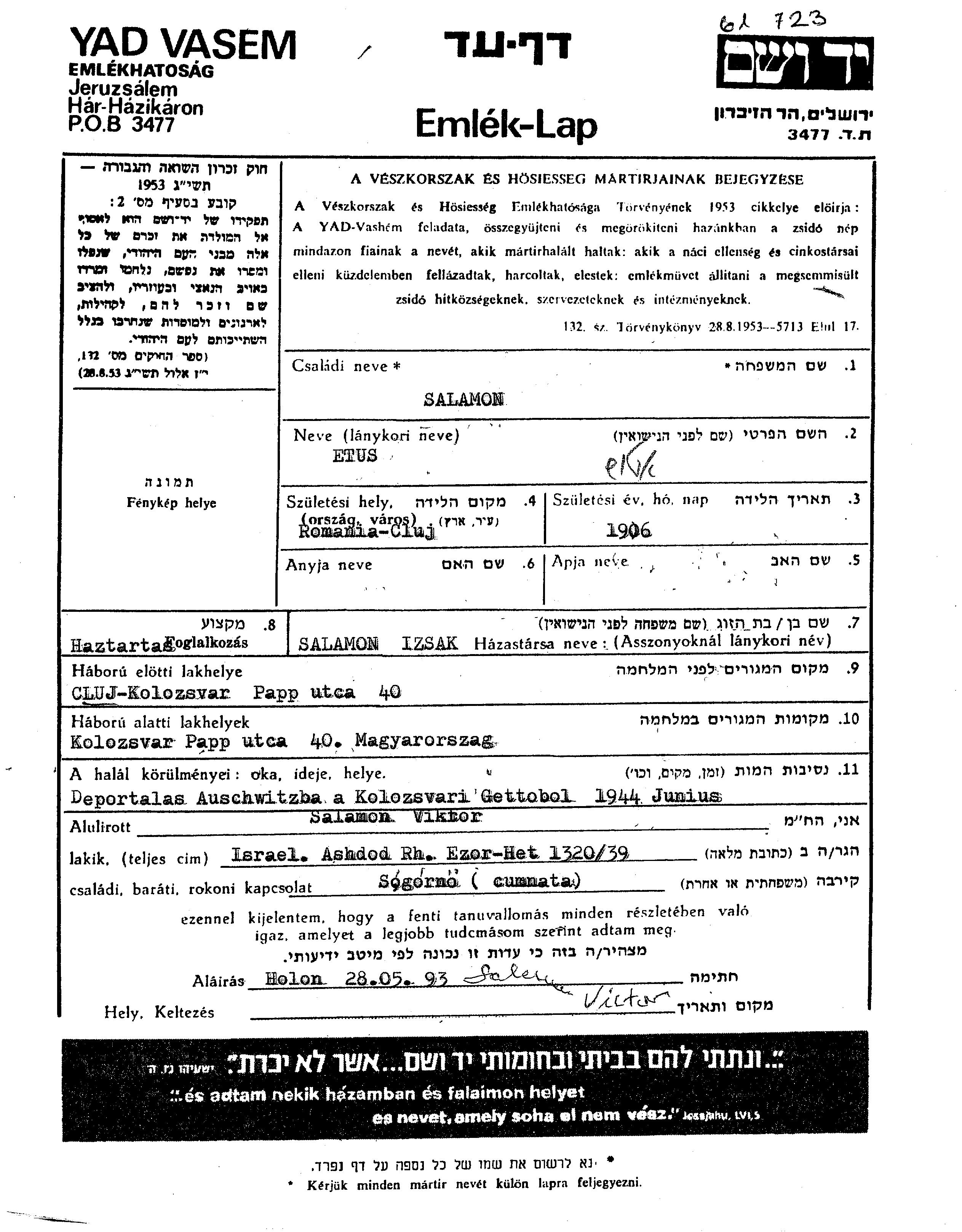 Etus Salamon Shalamon wurde im Jahr 1906 in Kolozsvar, Rumänien geboren. Sie war Hausfrau und mit Izsak Verheiratet. Vor dem Zweiten Weltkrieg lebte sie in Kolozsvar, Rumänien. Während des Krieges war sie in Kolozsvar, Rumänien.