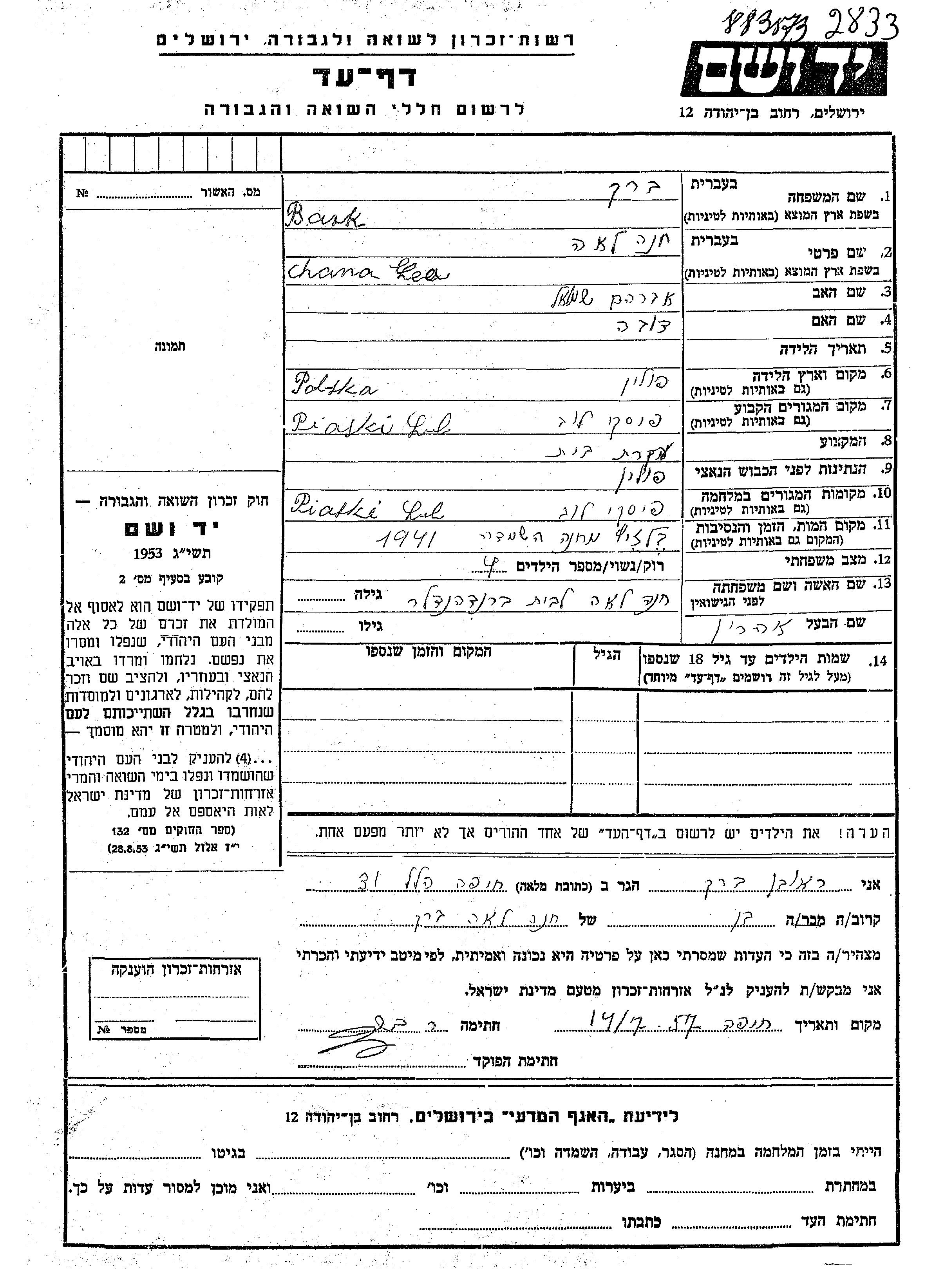 Bark Brak Chana Lea Piaski, Polen Gedenkblatt