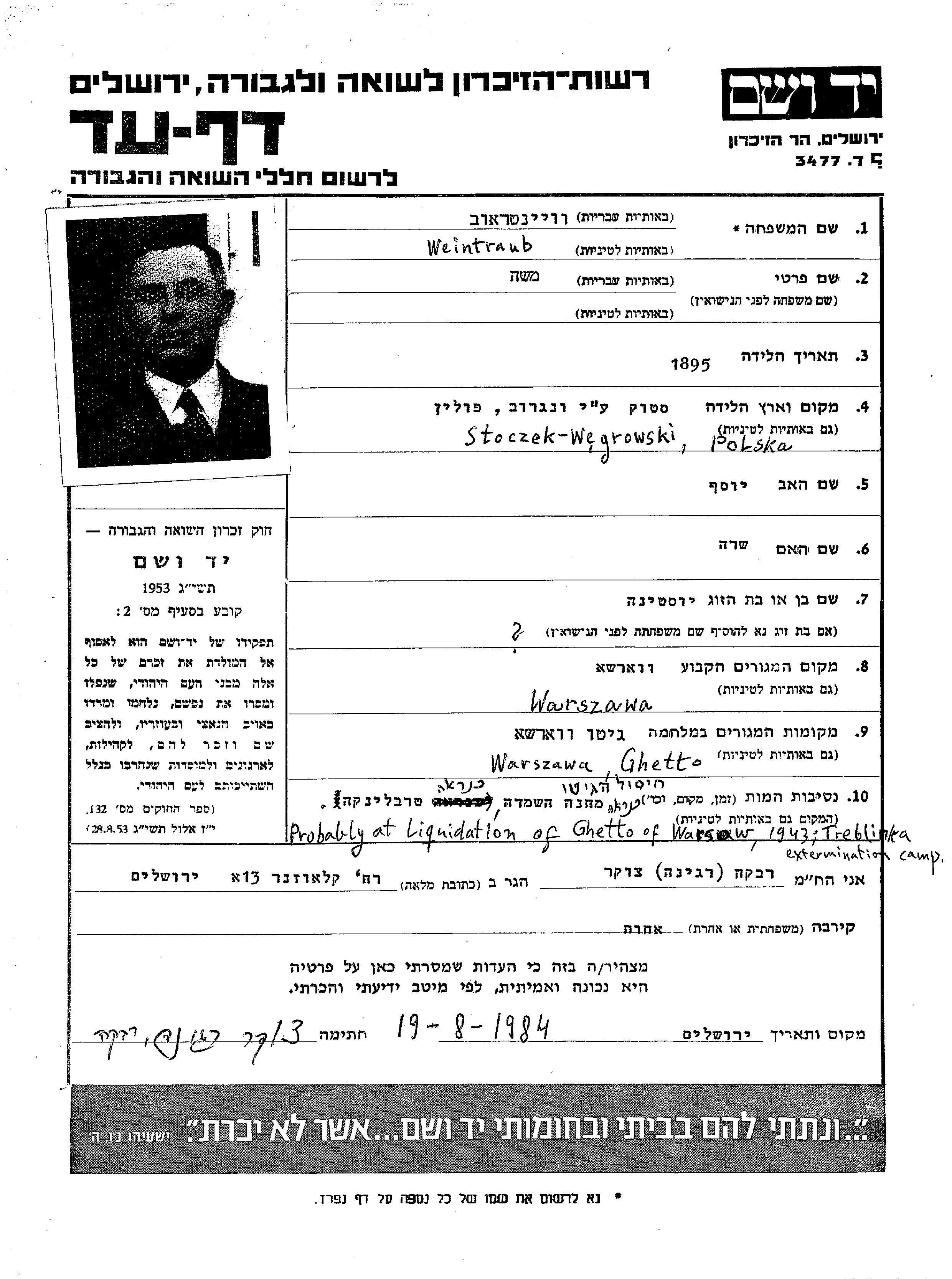Moshe Weintraub wurde im Jahr 1895 in Stoczek, Polen geboren. Vor dem Zweiten Weltkrieg lebte er in Warszawa, Polen.