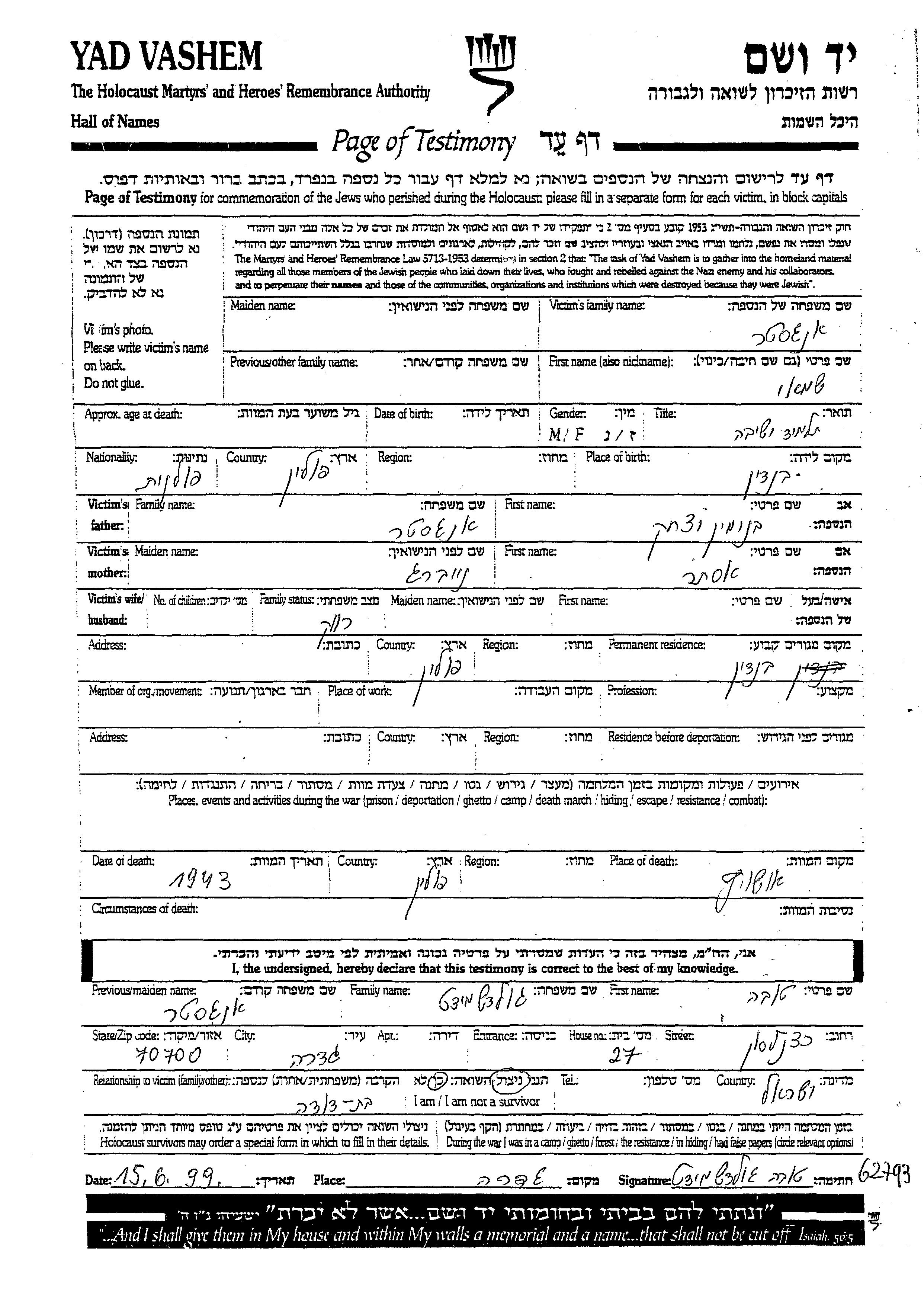 Ingster | Shamai | Bendin, Polen | Gedenkblatt | |