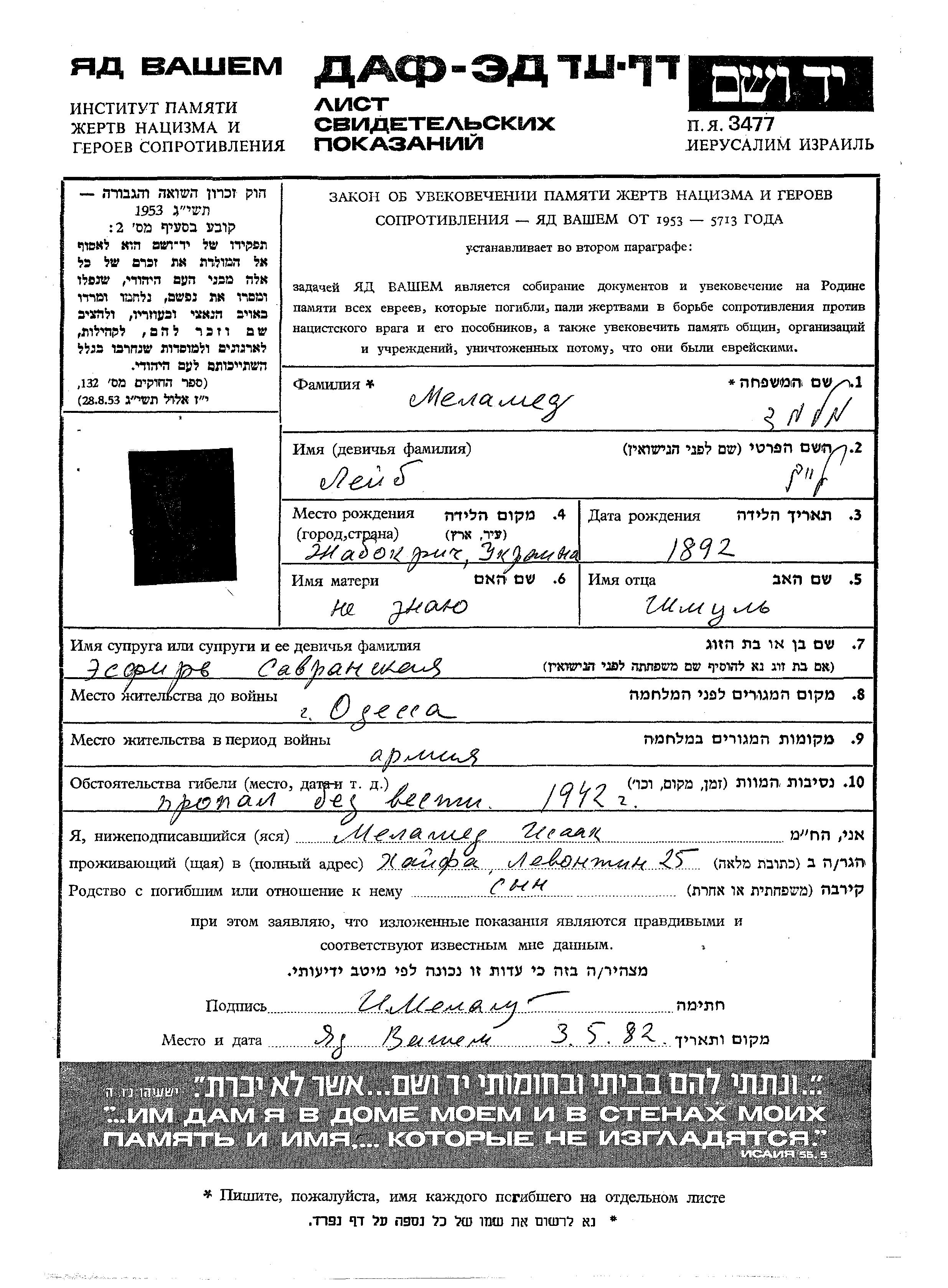 Leib Melamed wurde im Jahr 1892 in Zhabokrich, Ukraine (UdSSR) geboren. Vor dem Zweiten Weltkrieg lebte er in Odessa, Ukraine (UdSSR).