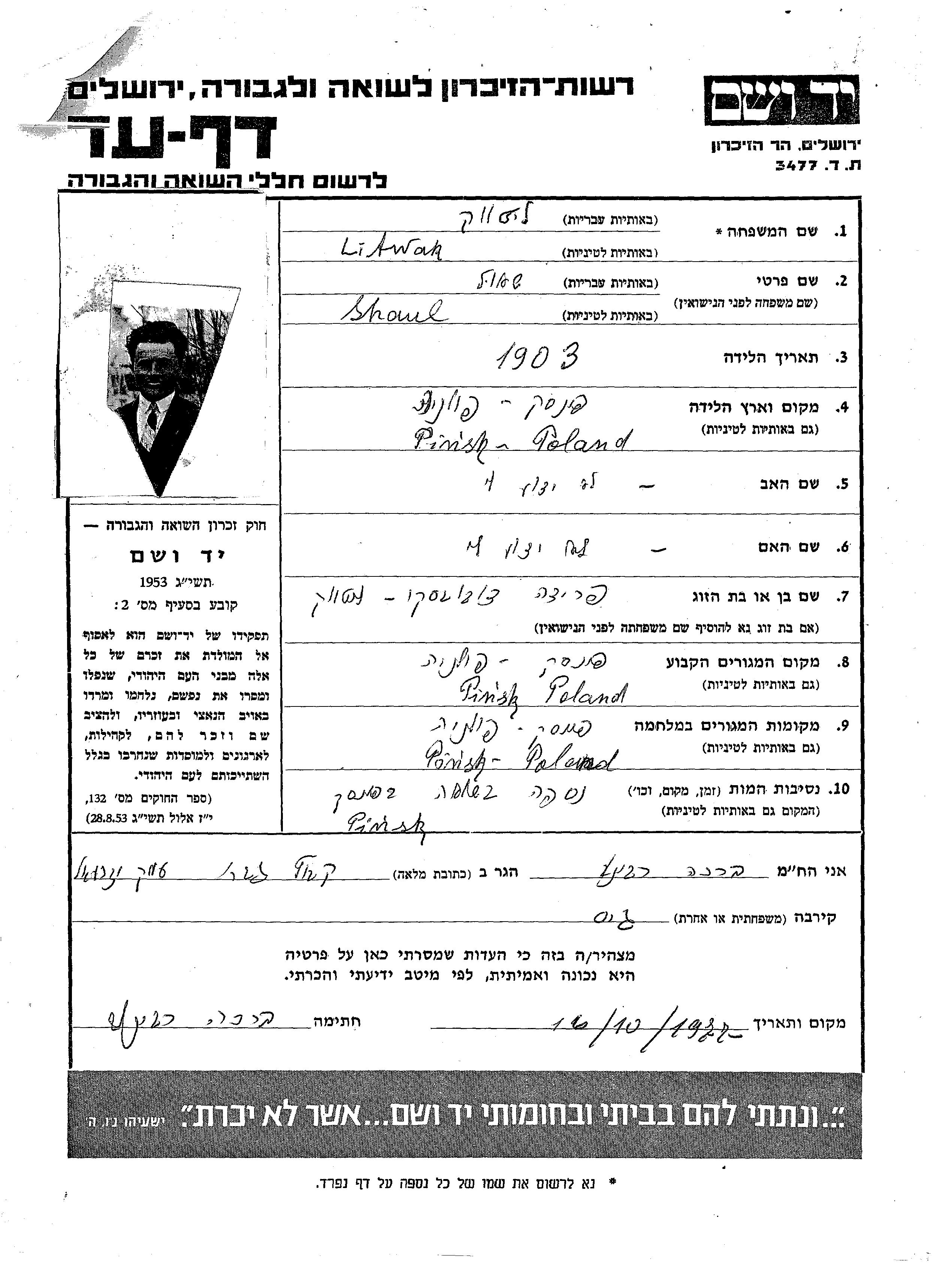 Shaul Litwak wurde im Jahr 1903 in Pinsk, Polen geboren. Vor dem Zweiten Weltkrieg lebte er in Pinsk, Polen.