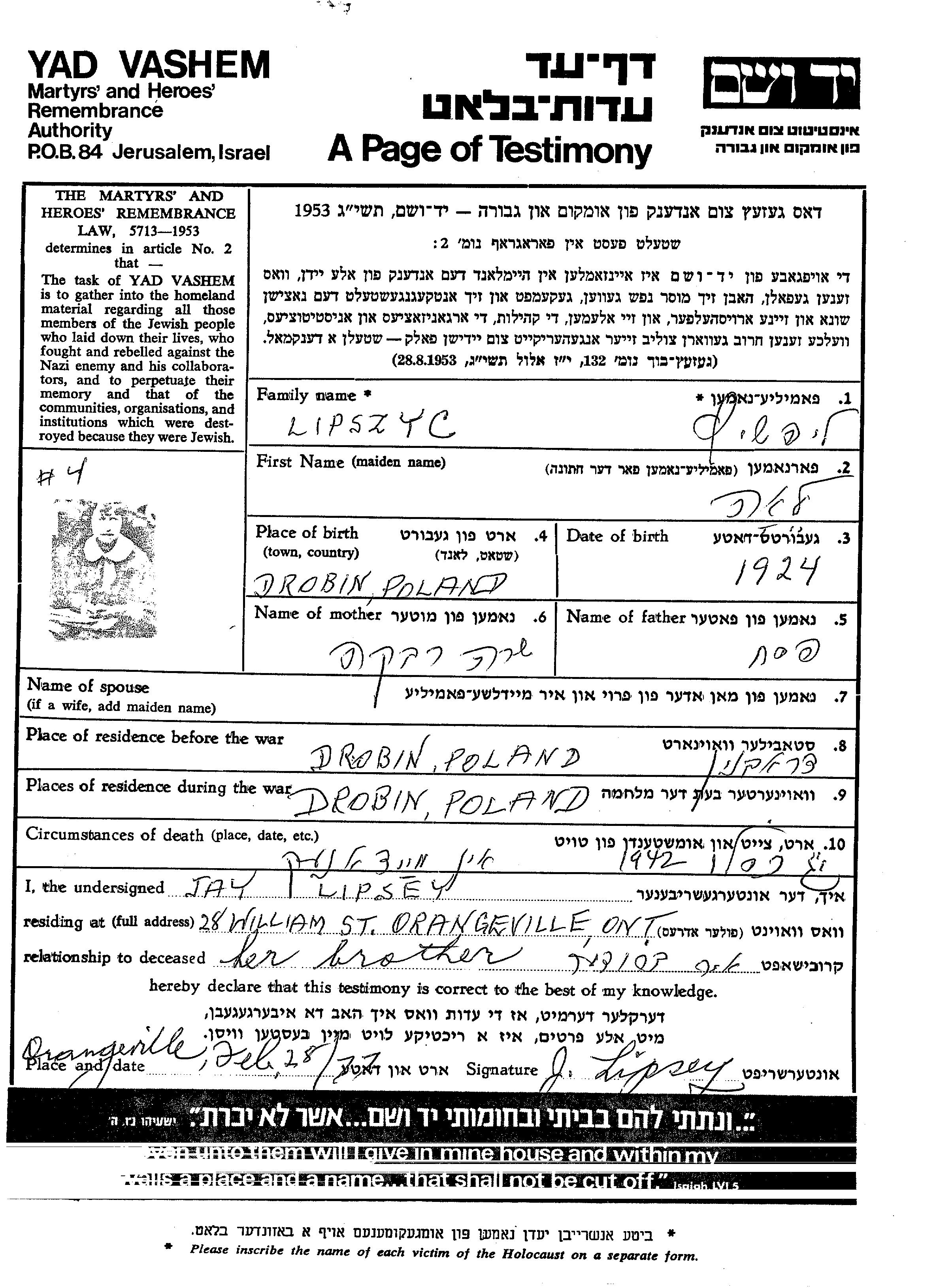 Lea Lipszyc wurde im Jahr 1924 in Drobin, Polen geboren. Vor dem Zweiten Weltkrieg lebte sie in Drobin, Polen.