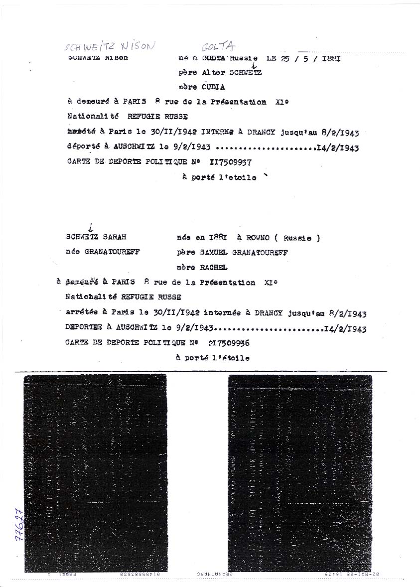 Sarah Schweitz, geb. Granatoureff wurde im Jahr 1881 in Rowne, Polen geboren. Vor dem Zweiten Weltkrieg lebte sie in Paris, Frankreich.