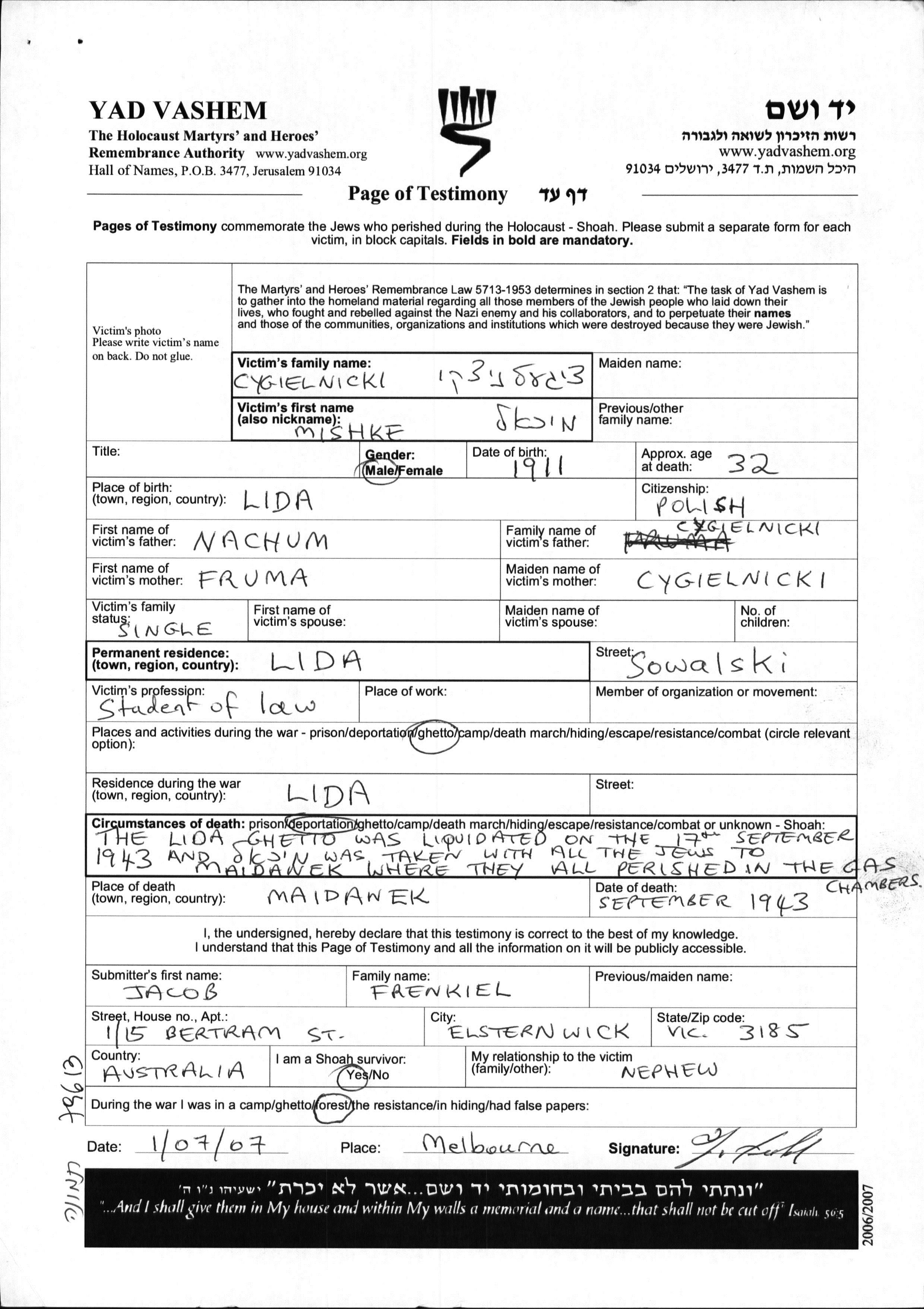 Mishke Cygielnicki wurde im Jahr 1911 in Lida, Polen geboren. Er war Jurastudent. Vor dem Zweiten Weltkrieg lebte er in Lida, Polen.