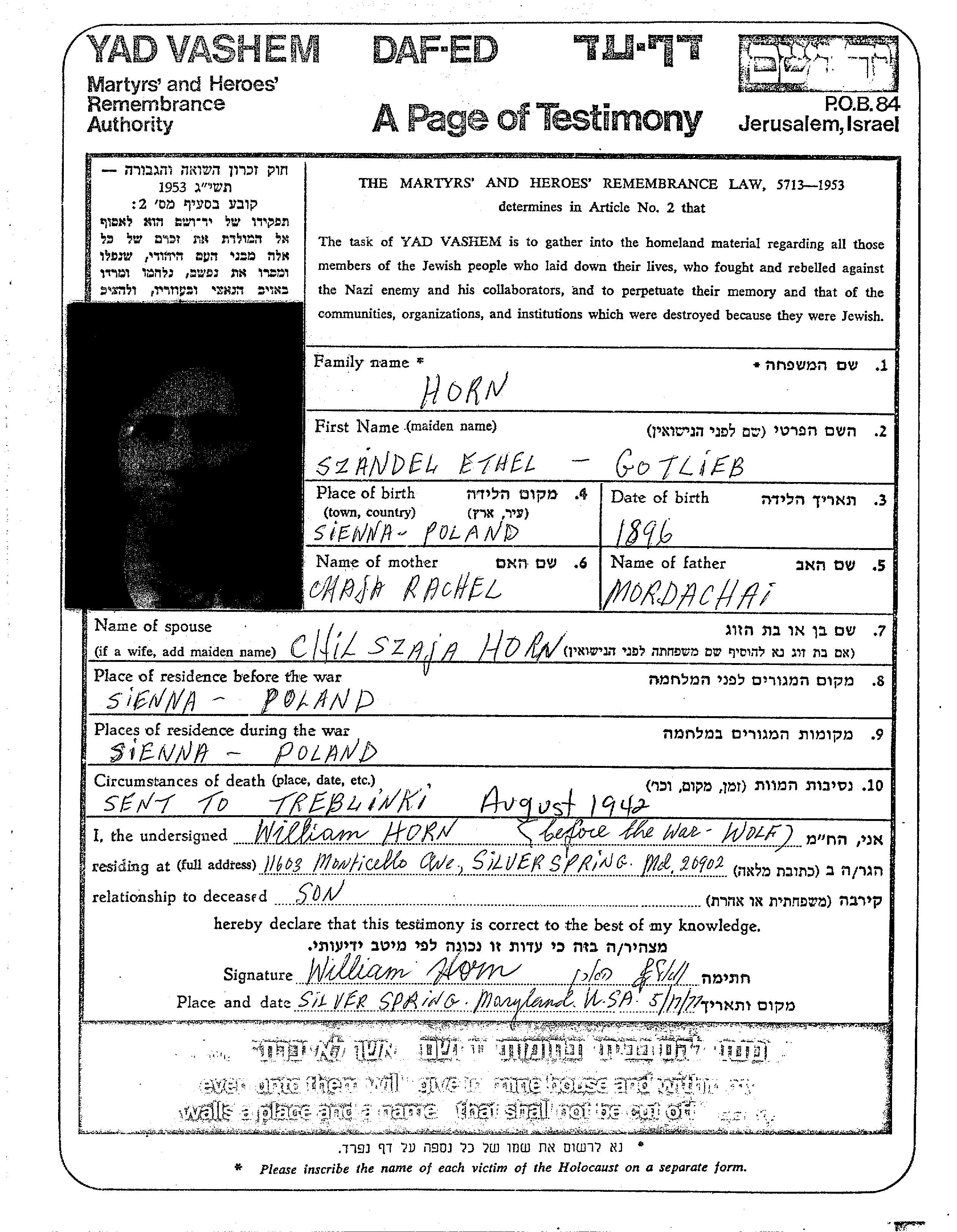 Szandel Ethel Horn, geb. Gotlieb wurde im Jahr 1896 in Sienno, Polen geboren. Vor dem Zweiten Weltkrieg lebte sie in Sienno, Polen.