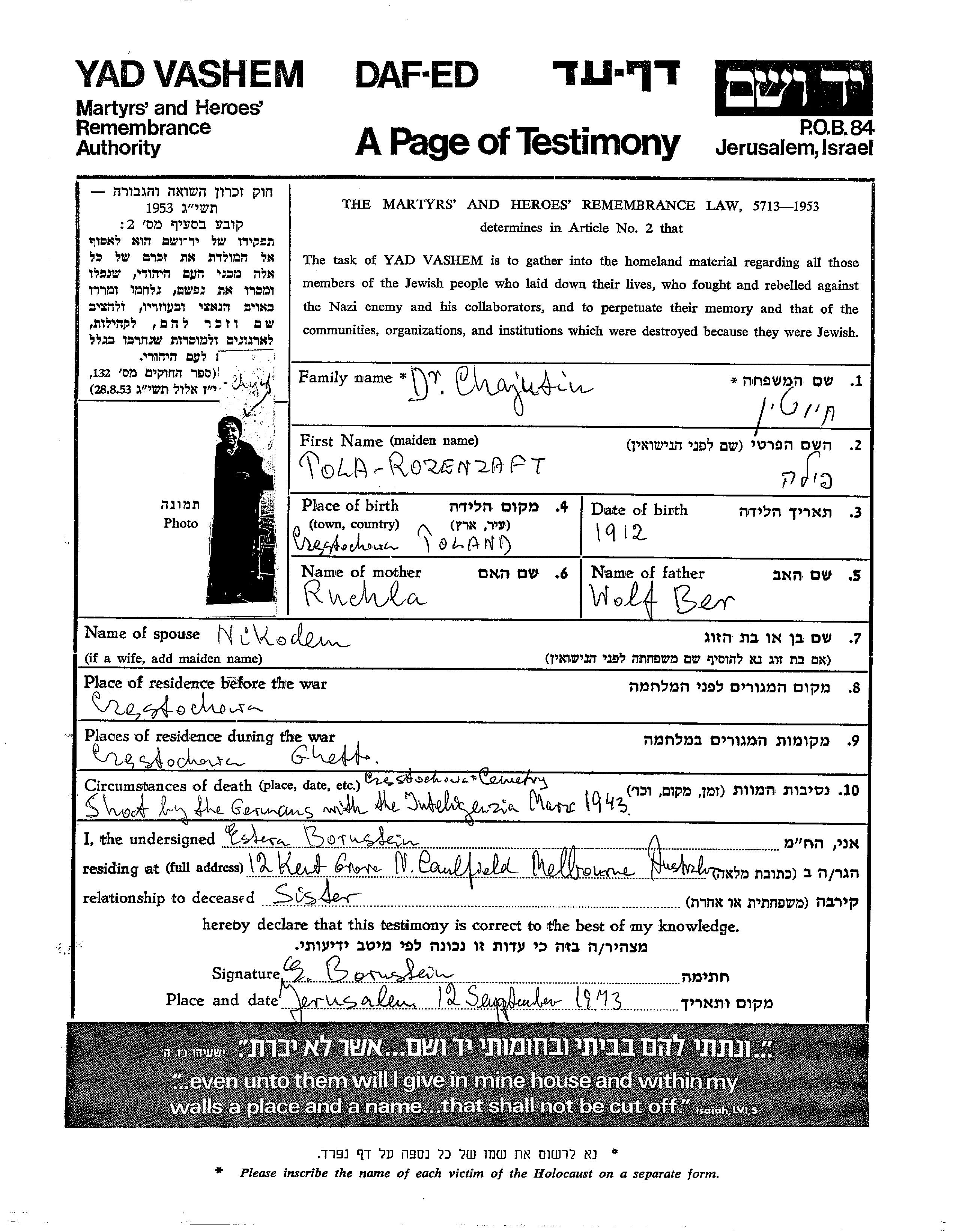 Pola Chajutin, geb. Rozenzaft wurde im Jahr 1912 in Czestochowa, Polen geboren. Vor dem Zweiten Weltkrieg lebte sie in Czestochowa, Polen.