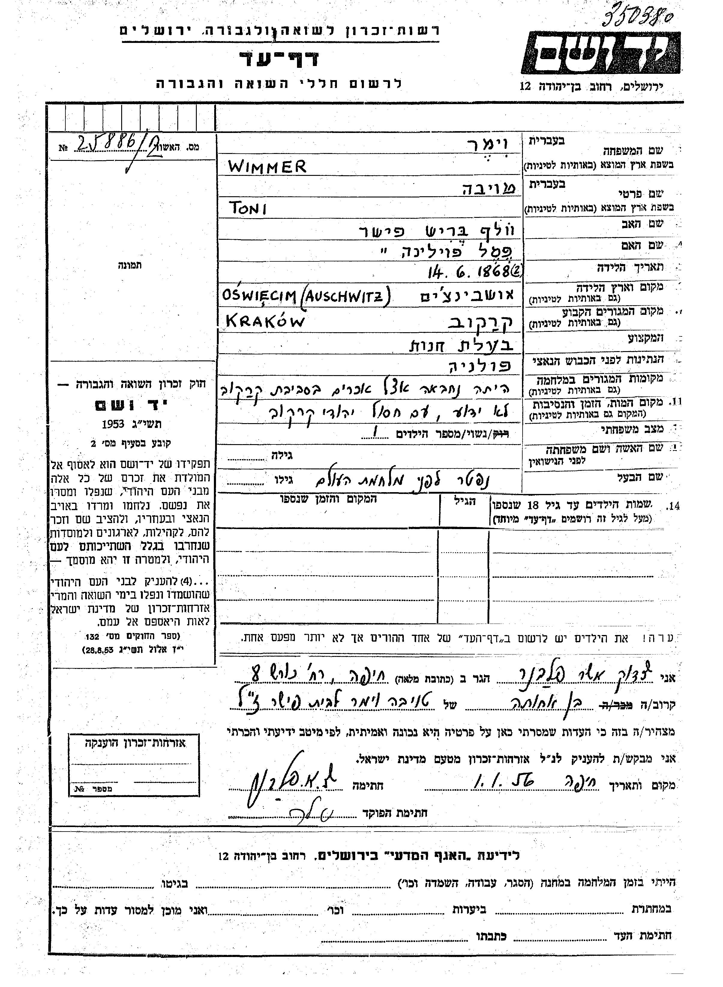 Toni Toibe Wimmer wurde im Jahr 1868 in Oświęcim, Polen geboren. Sie war Ladenbesitzer/-in. Vor dem Zweiten Weltkrieg lebte sie in Krakow, Polen.