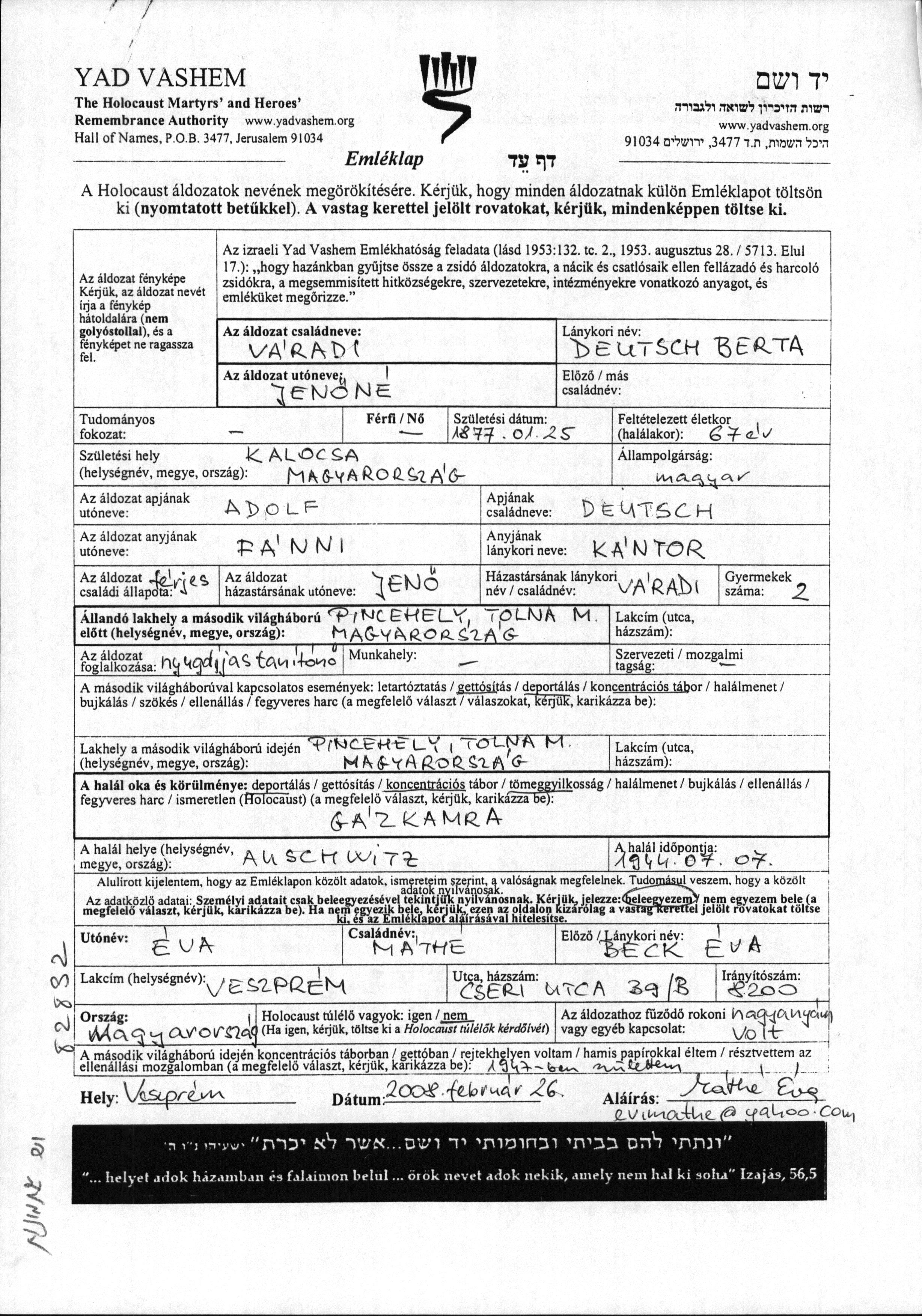 Varadi | Berta | 1877 | Pincehely, Ungarn | Gedenkblatt |