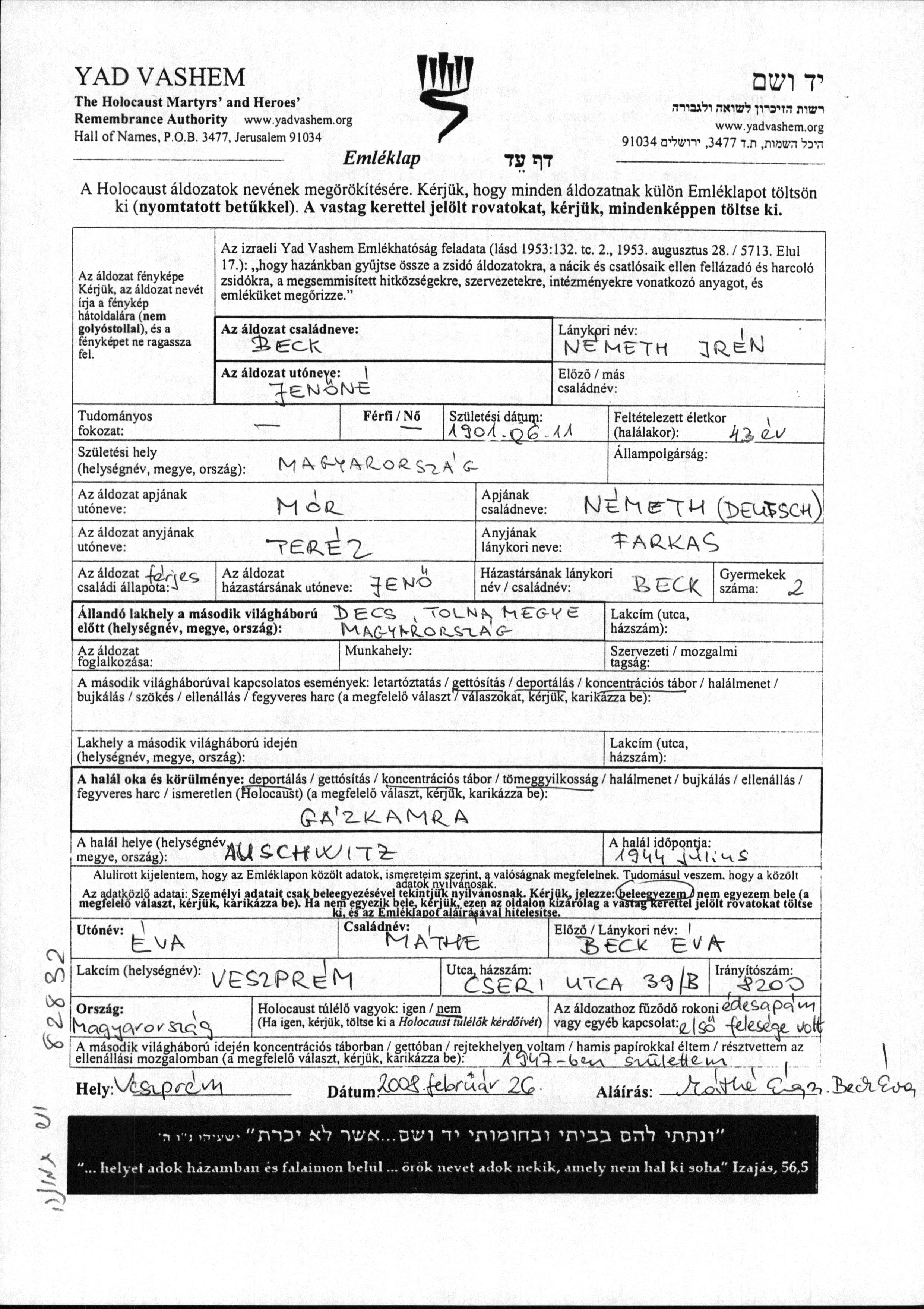 Iren Beck, geb. Nemeth Deutsch wurde im Jahr 1911 in Ungarn geboren. Vor dem Zweiten Weltkrieg lebte sie in Decs, Ungarn.