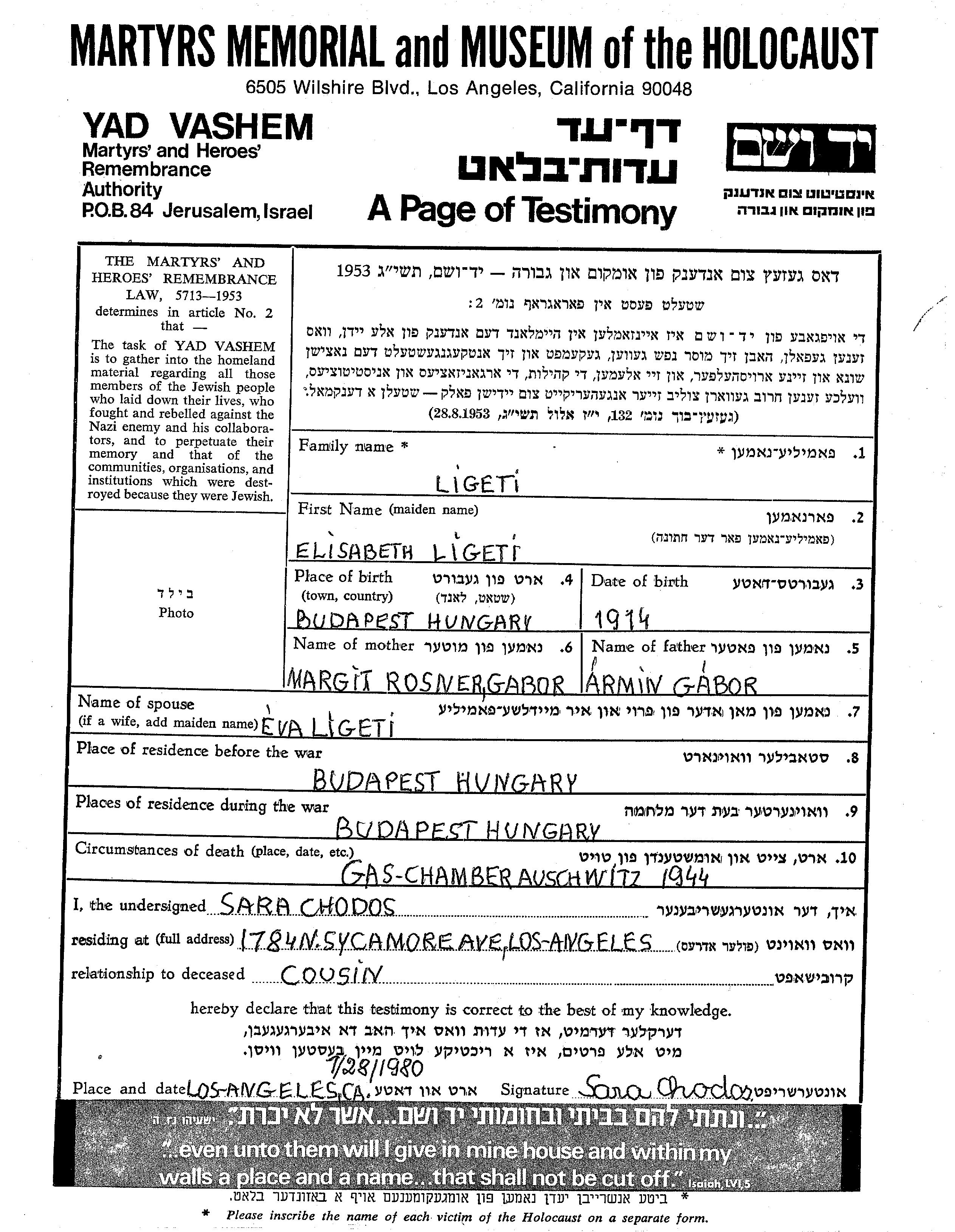 Elisabeth Ligeti, geb. Gabor wurde im Jahr 1914 in Budapest, Ungarn geboren. Vor dem Zweiten Weltkrieg lebte sie in Budapest, Ungarn.