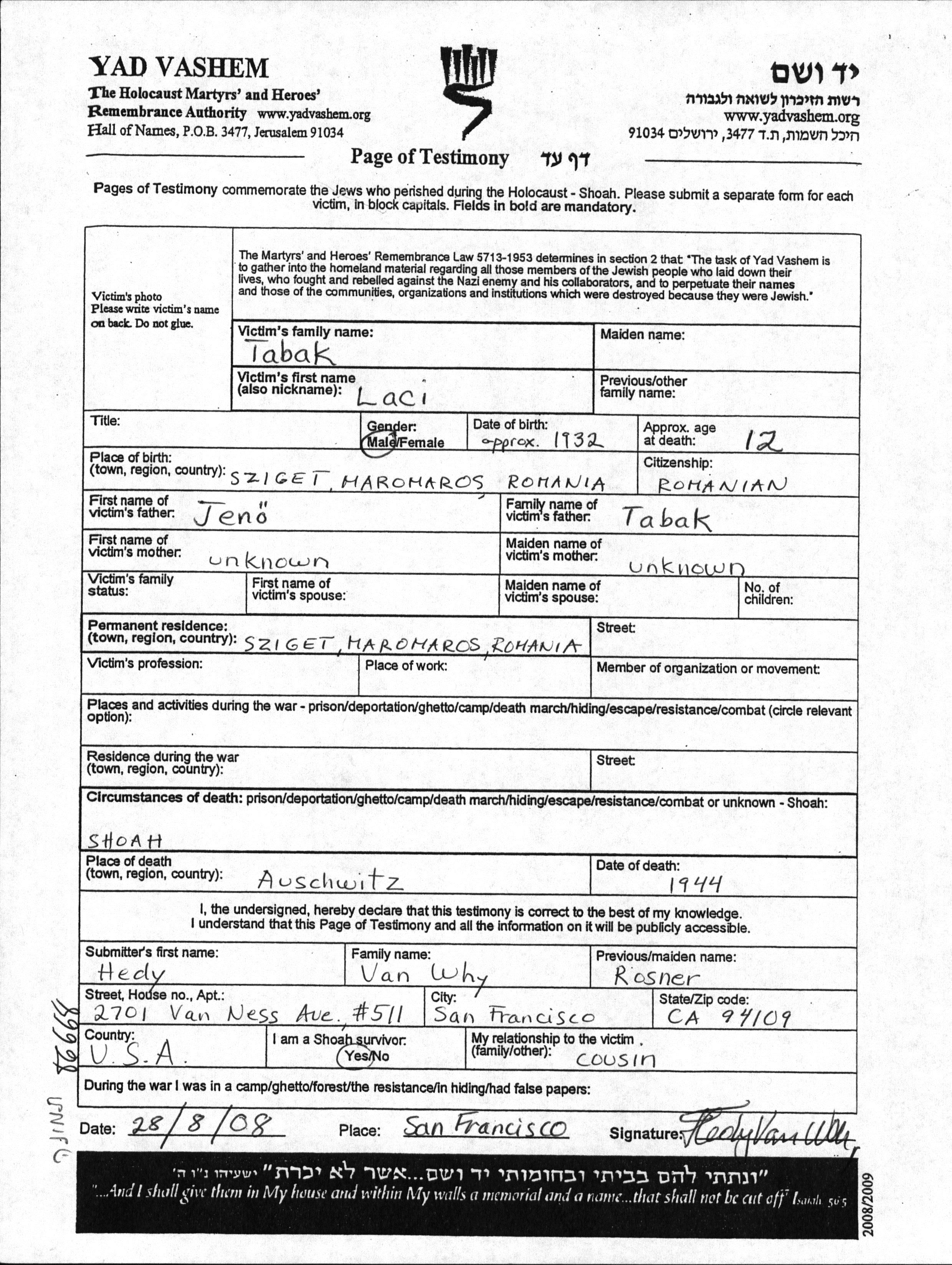 Laci Tabak wurde im Jahr 1932 in Sighet, Rumänien geboren. Vor dem Zweiten Weltkrieg lebte er in Sighet, Rumänien.
