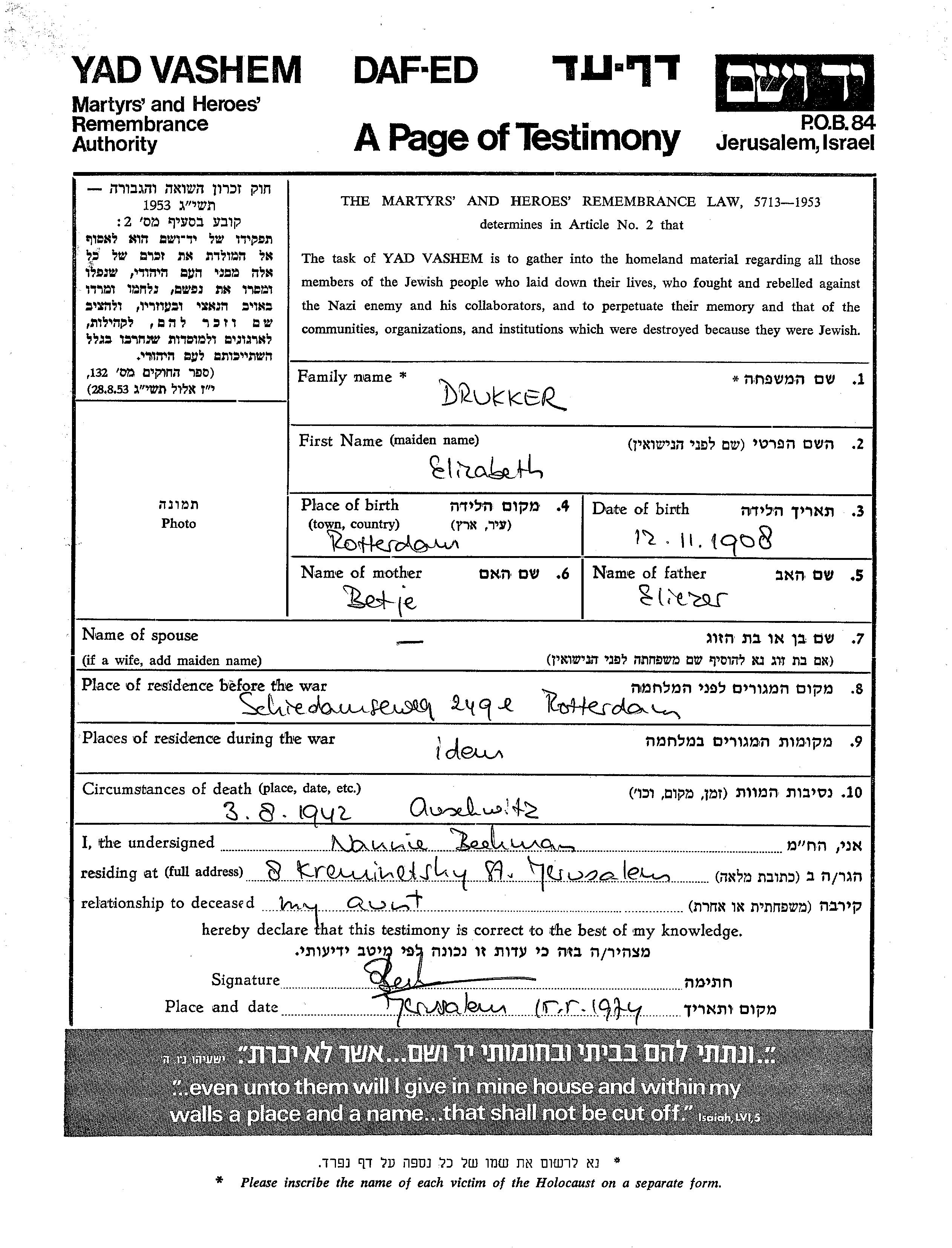 Elizabeth Drukker wurde im Jahr 1908 in Rotterdam, Niederlande geboren. Vor dem Zweiten Weltkrieg lebte sie in Rotterdam, Niederlande.