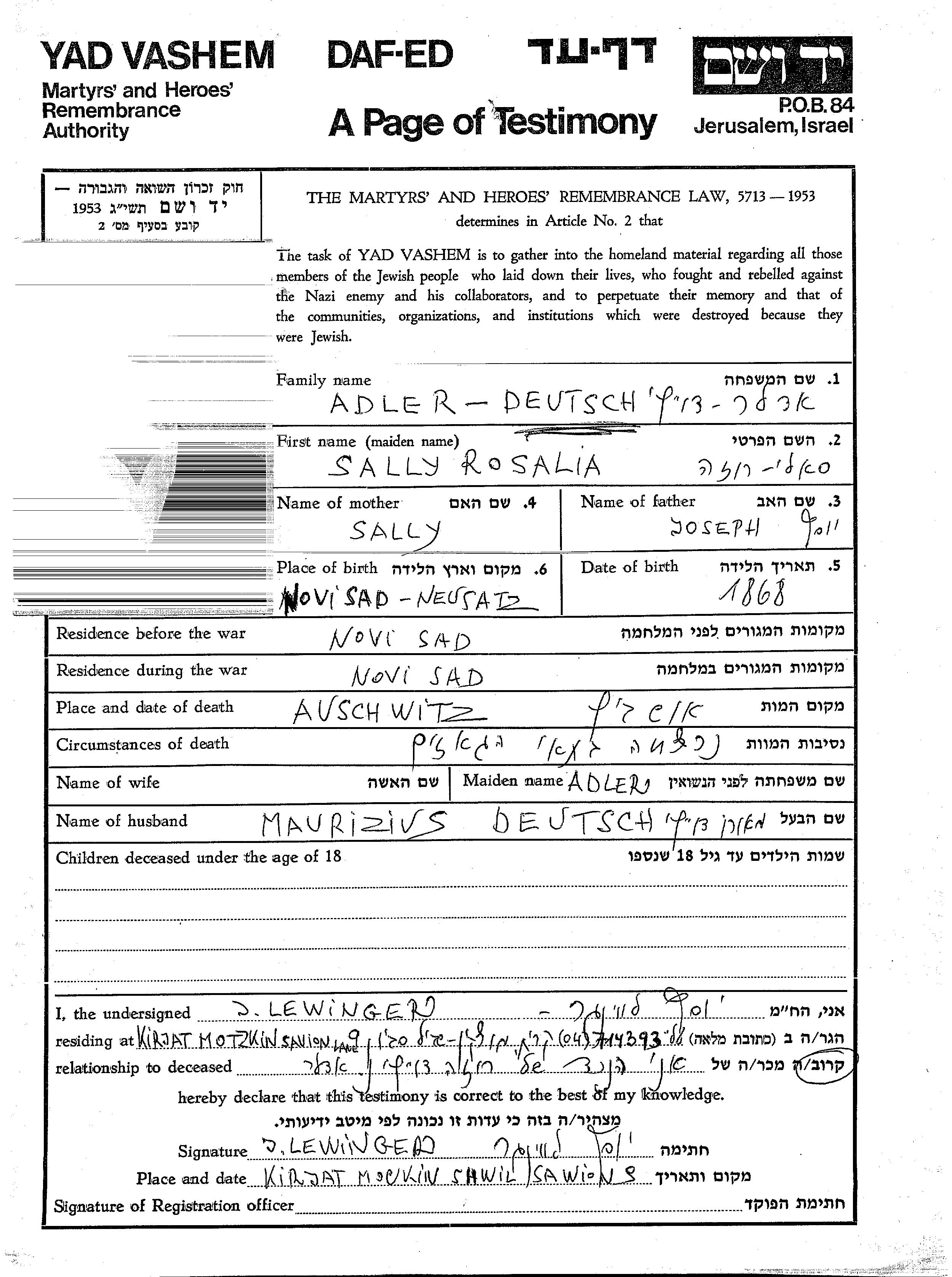 Sally Rosalia Deutsch Adler, geb. Adler wurde im Jahr 1868 in Novi Sad, Jugoslawien geboren. Vor dem Zweiten Weltkrieg lebte sie in Novi Sad, Jugoslawien.