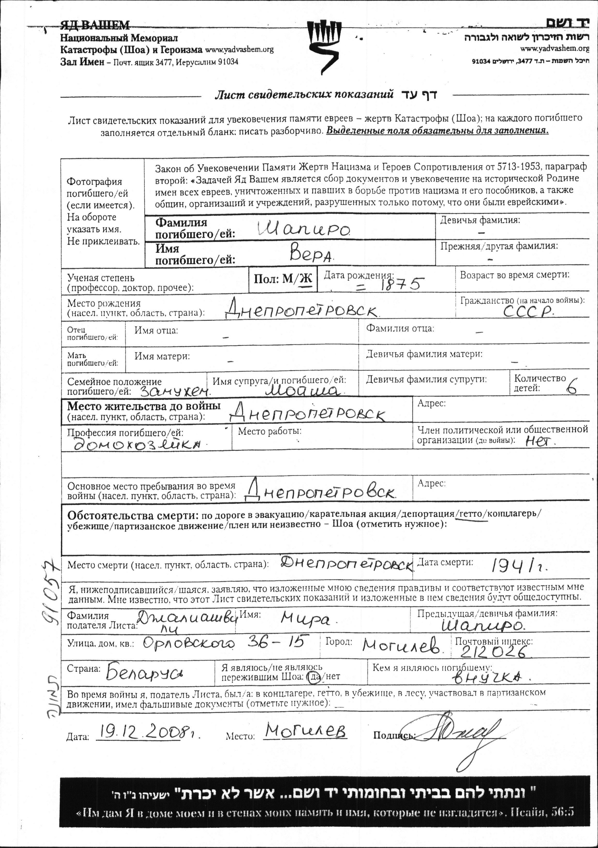 Vera Shapiro wurde im Jahr 1875 in Dnepropetrovsk, Ukraine (UdSSR) geboren. Sie war Hausfrau. Vor dem Zweiten Weltkrieg lebte sie in Dnepropetrovsk, Ukraine (UdSSR).