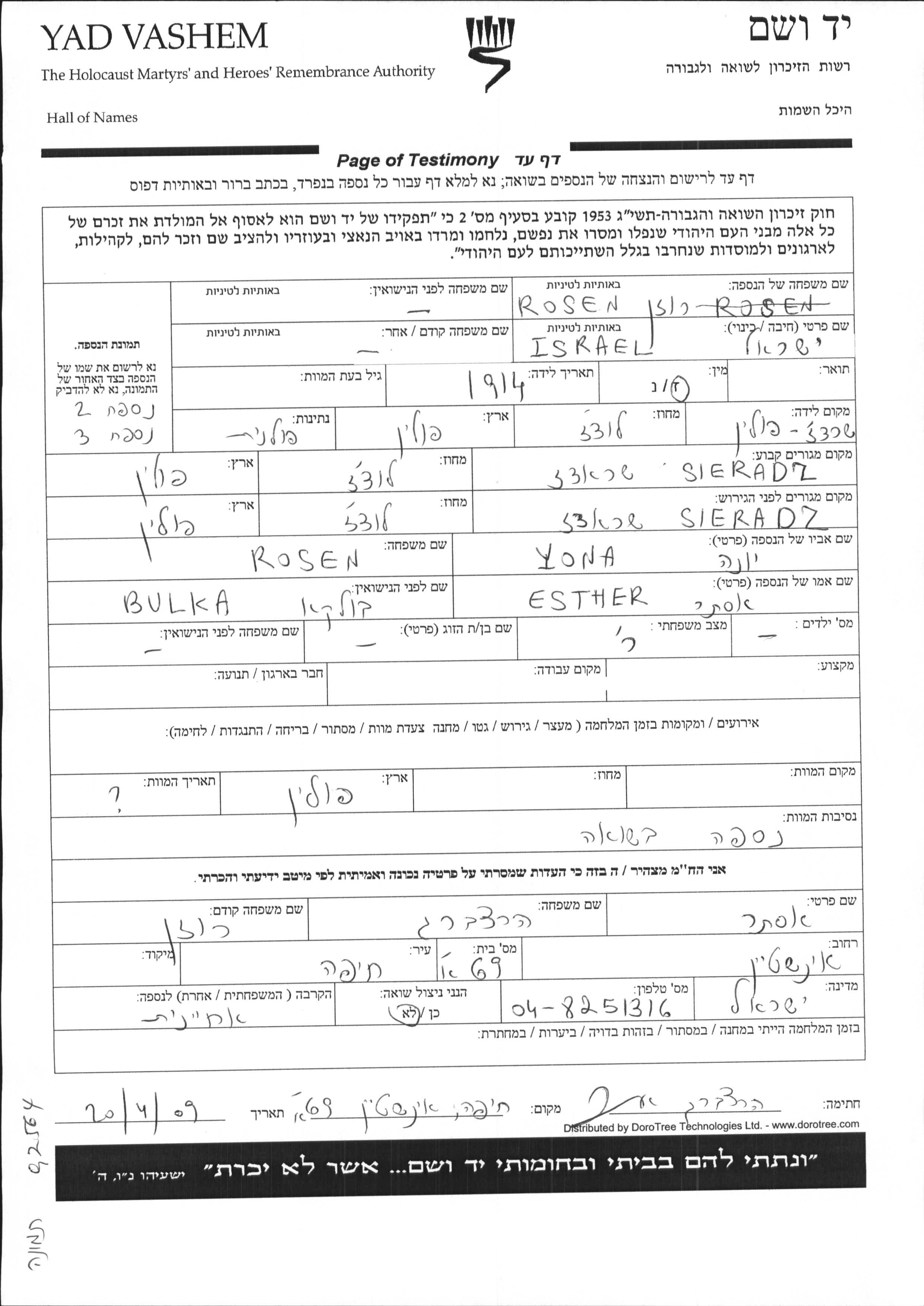 Israel Rosen wurde im Jahr 1914 in Sieradz, Polen geboren. Vor dem Zweiten Weltkrieg lebte er in Sieradz, Polen.