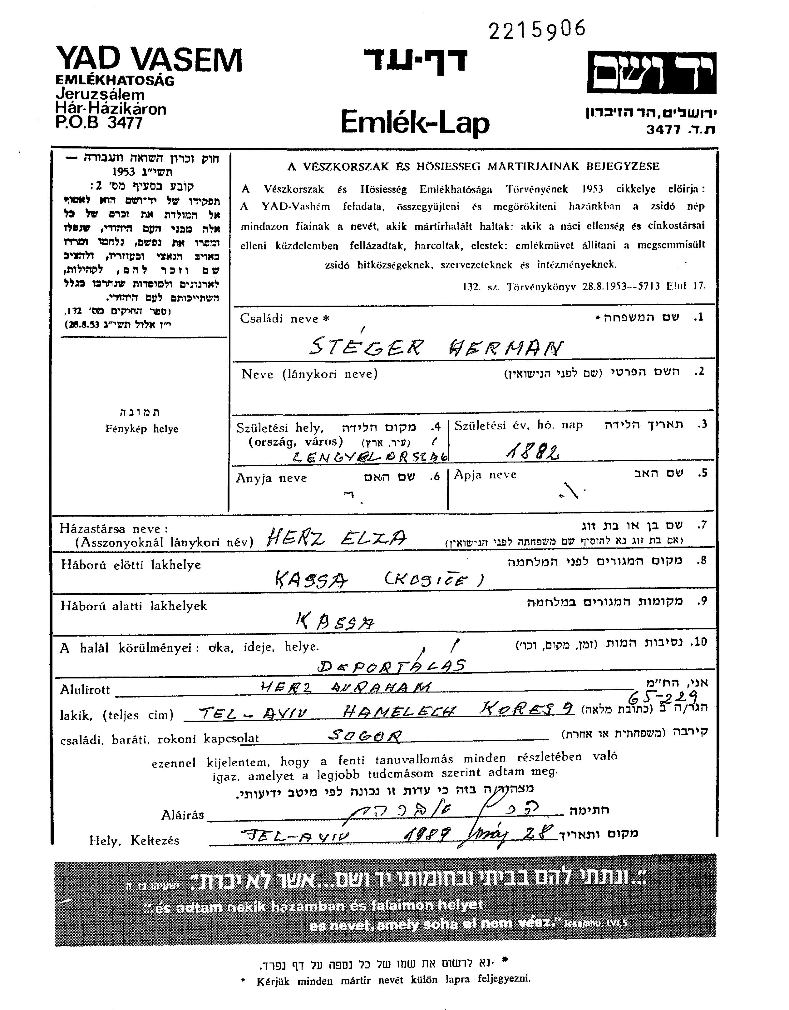 Herman Steger wurde in Lengyel, Ungarn geboren. Er war mit Elza Verheiratet. Vor dem Zweiten Weltkrieg lebte er in Kassa, Tschechoslowakei. Während des Krieges war er in Kassa, Tschechoslowakei.