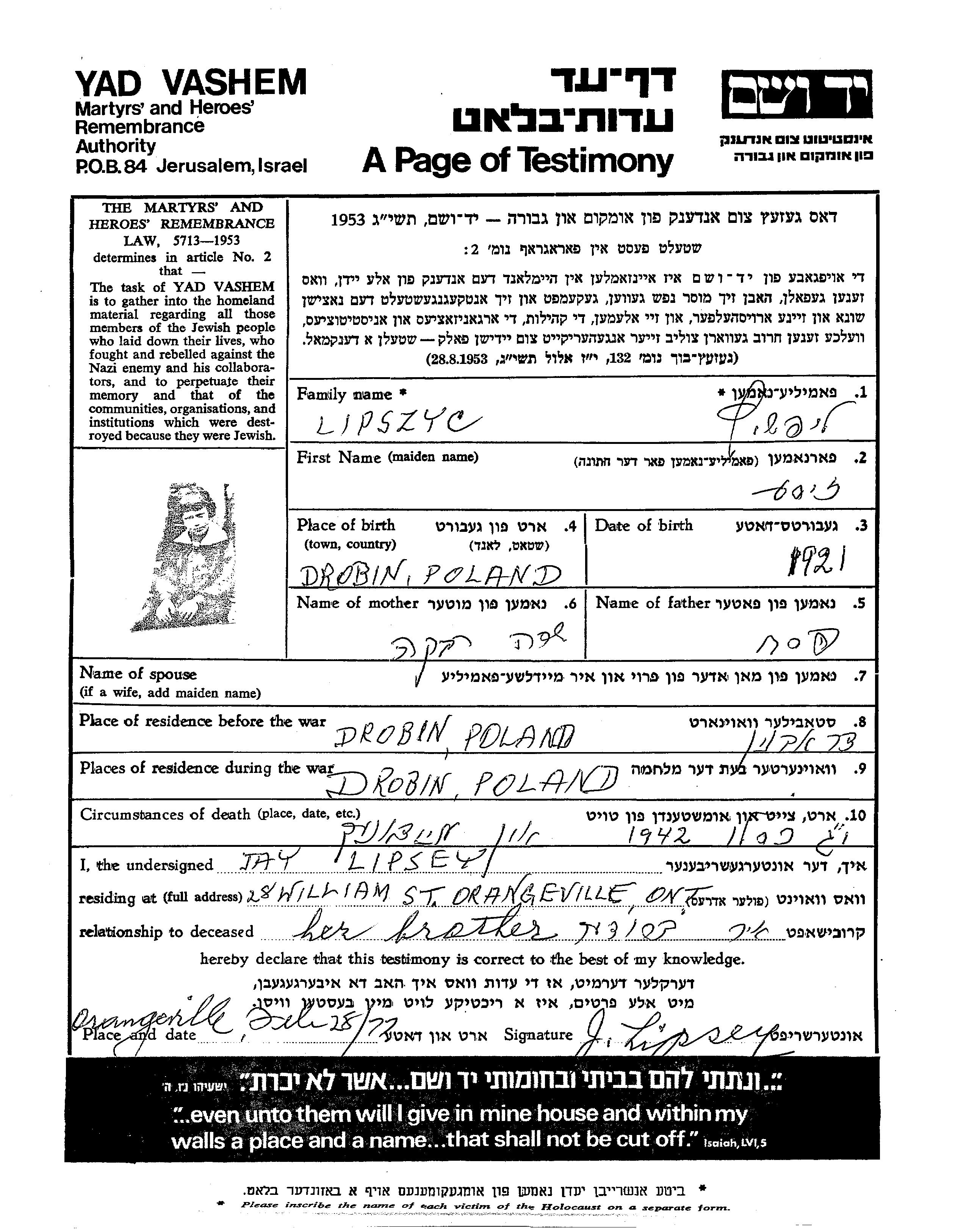 Zise Lipszyc wurde im Jahr 1921 in Drobin, Polen geboren. Vor dem Zweiten Weltkrieg lebte sie in Drobin, Polen.