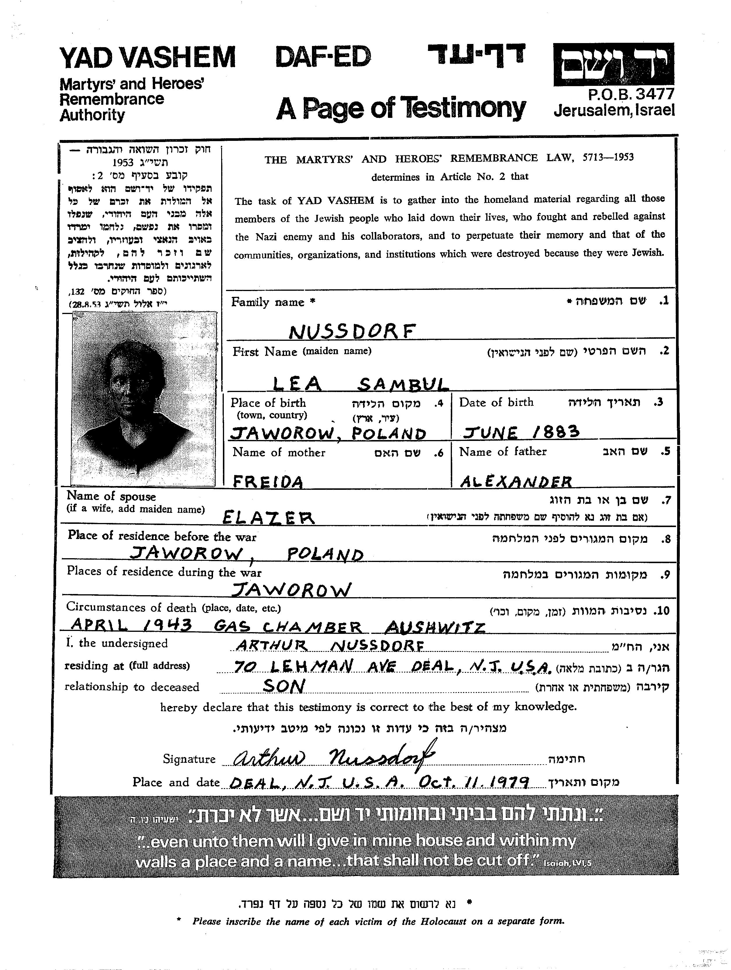 Lea Nussdorf, geb. Sambul wurde im Jahr 1883 in Jaworow, Polen geboren. Vor dem Zweiten Weltkrieg lebte sie in Jaworow, Polen.