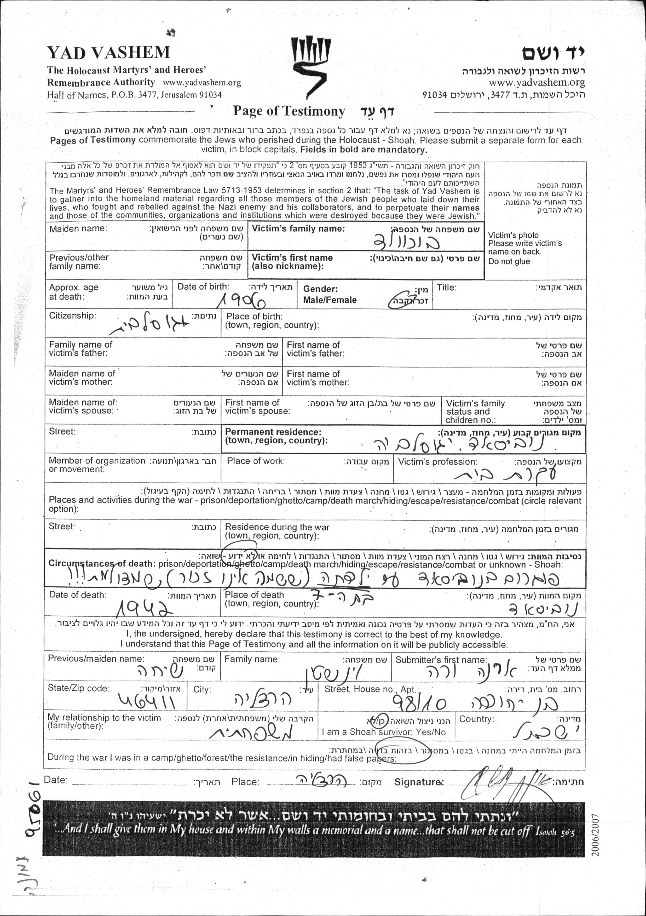 Vorname unbekannt Bukhvald wurde im Jahr 1906 geboren. Sie war Hausfrau. Vor dem Zweiten Weltkrieg lebte sie in Novi Sad, Jugoslawien.