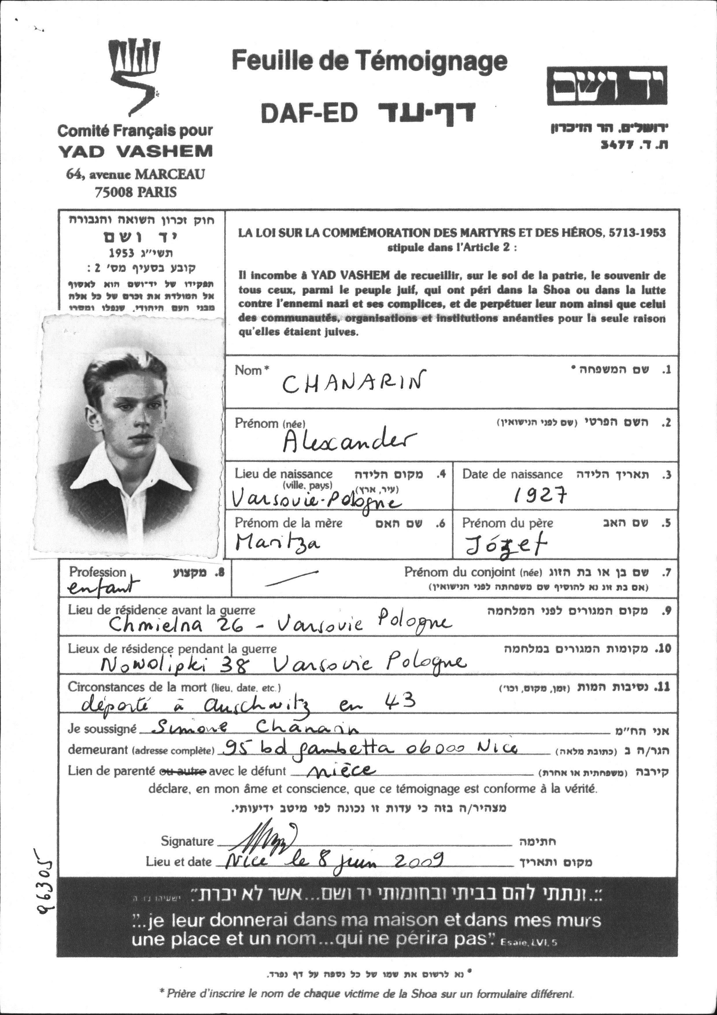 Alexander wurde in der Schoah ermordet. Todesort: Auschwitz, Polen.